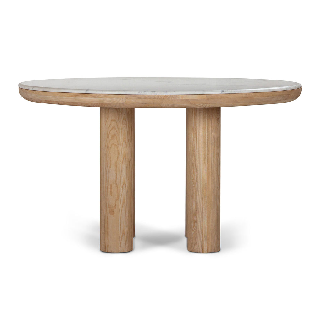 Combining simple geometry with an elegant mix of materials, the Union Home Pillar dining table strikes a bold profile. Four sturdy, solid Ash legs gracefully support a softly profiled, solid Banswara marble top that seamlessly transitions into a sculpted, solid Ash apron.