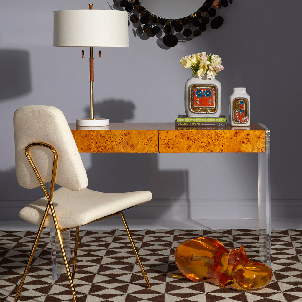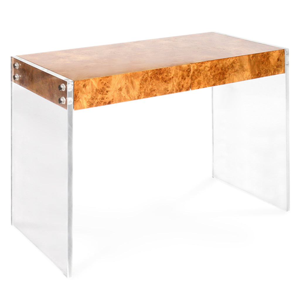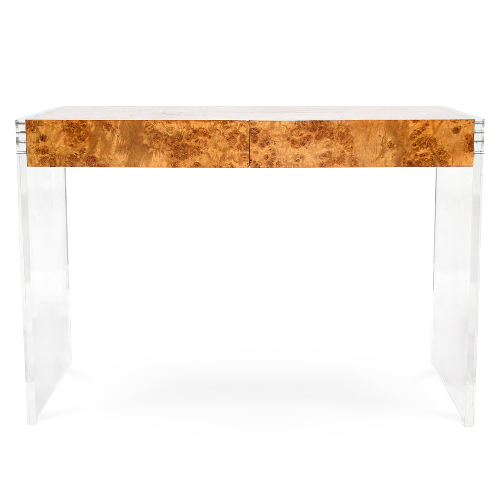 From the chic Jonathan Adler burled wood collection, pieced mappa wood floats between clear acrylic legs with stainless steel accents. Fully finished drawers with hidden pulls create a clean silhouette that's fierce from any angle. Work its minimalist magic as a small desk or stylish console.