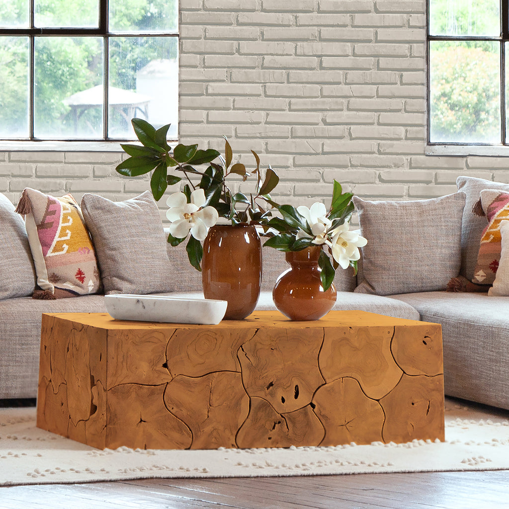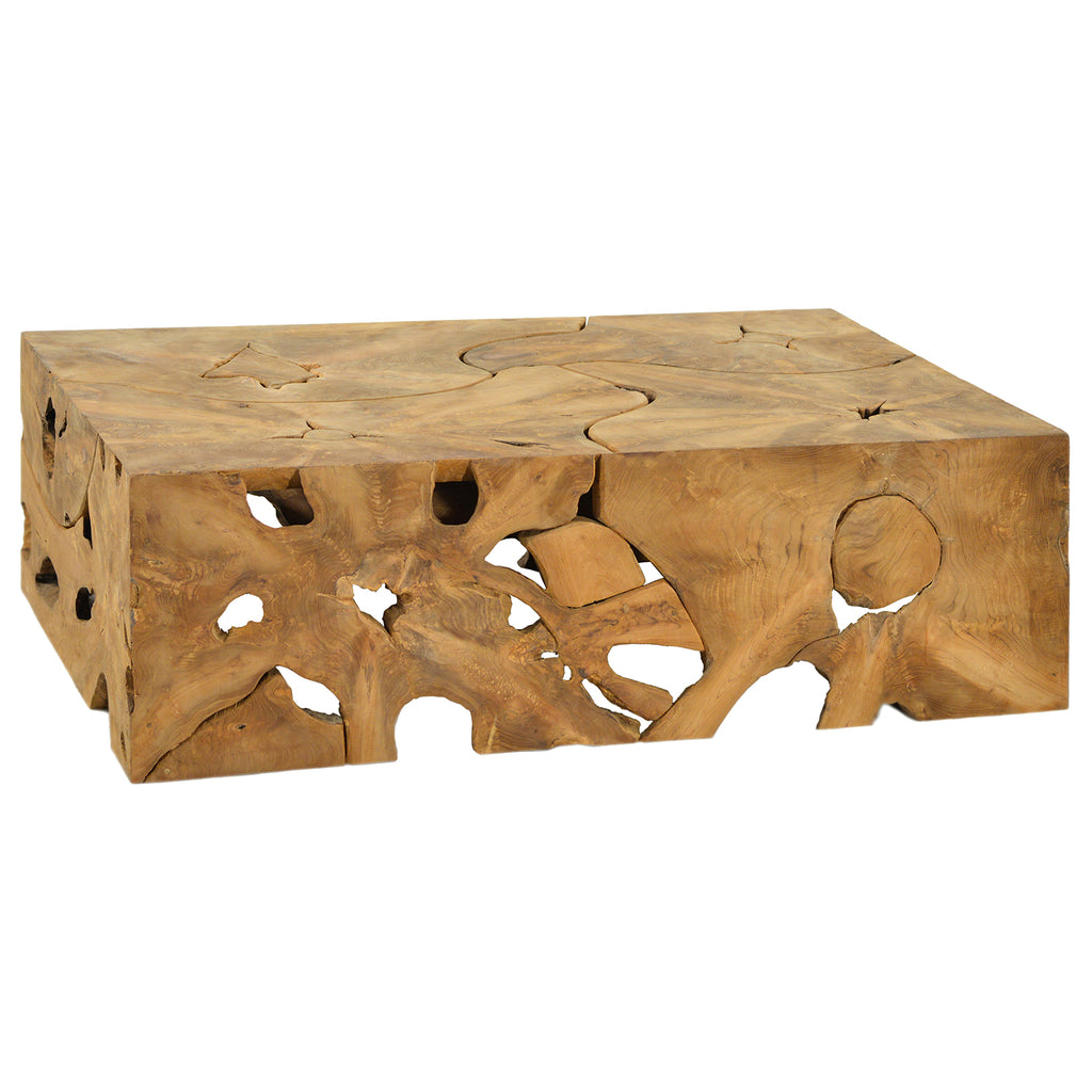 Pieced together from reclaimed slabs and chunks of solid teak wood finished in a bleached or natural finish with exquisite craftsmanship. Artisans build each bench like a puzzle, fitting each piece together in combinations that are never duplicated. Like true works of art, no two will be exactly alike. Each rectangular coffee table is perfectly sized to complement any living room or sitting area.