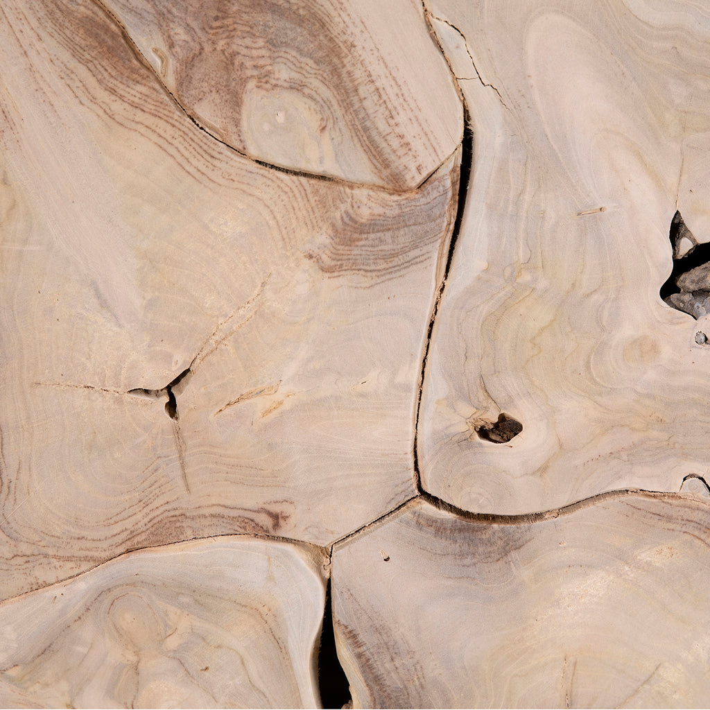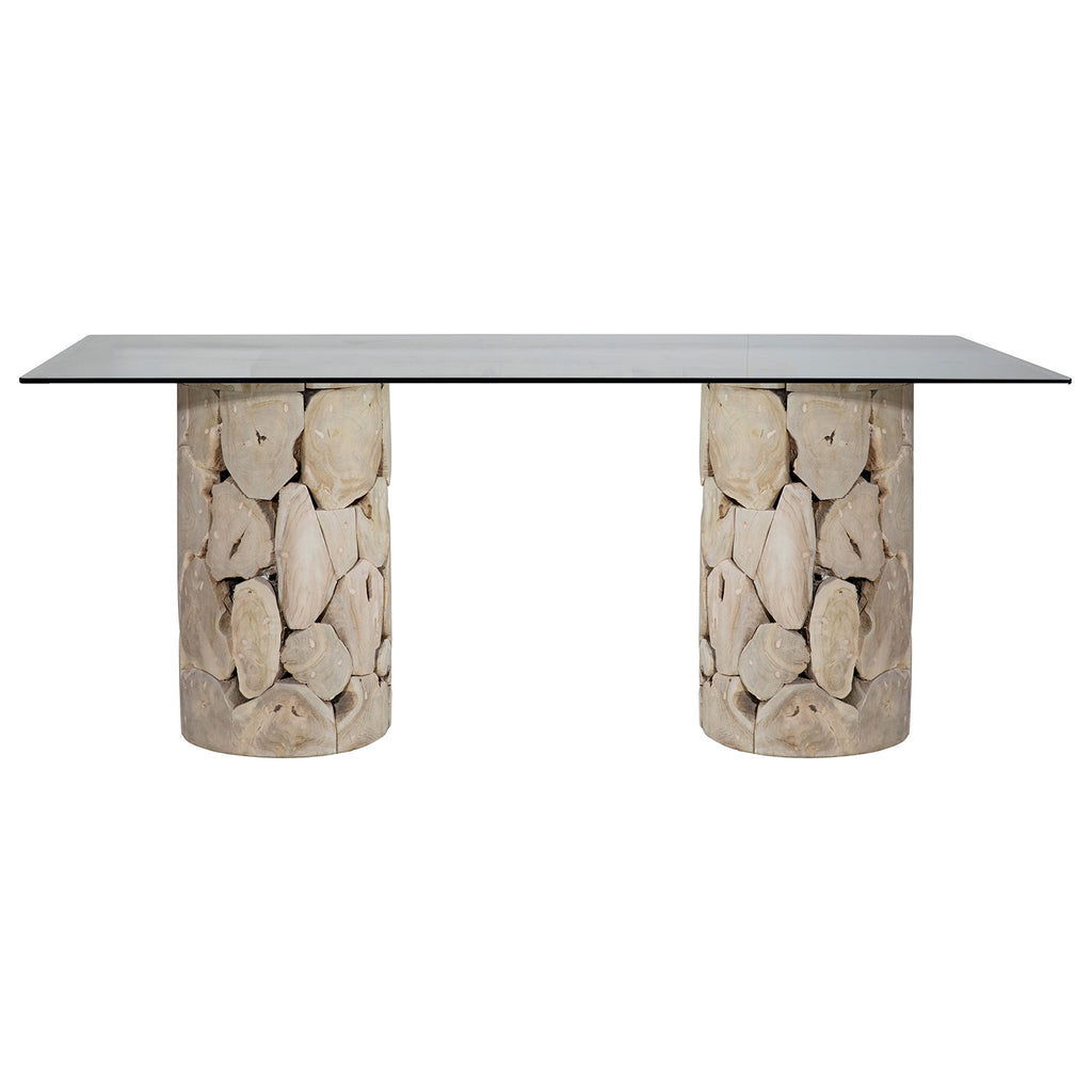 Create the ultimate gathering space with this teak base Scarlett Dining Table. Featuring a textured, teakwood bark base and glass top in a sealed bleach wood finish. Perfect for serving everyday meals or hosting special occasions.