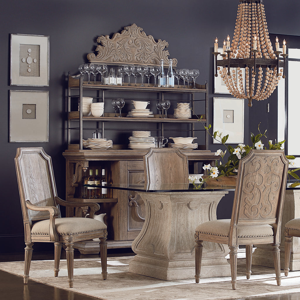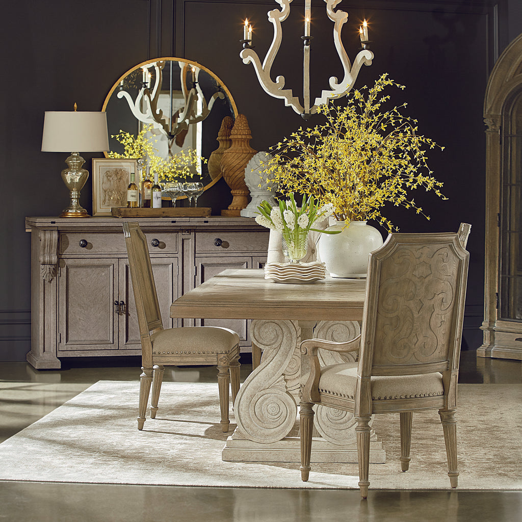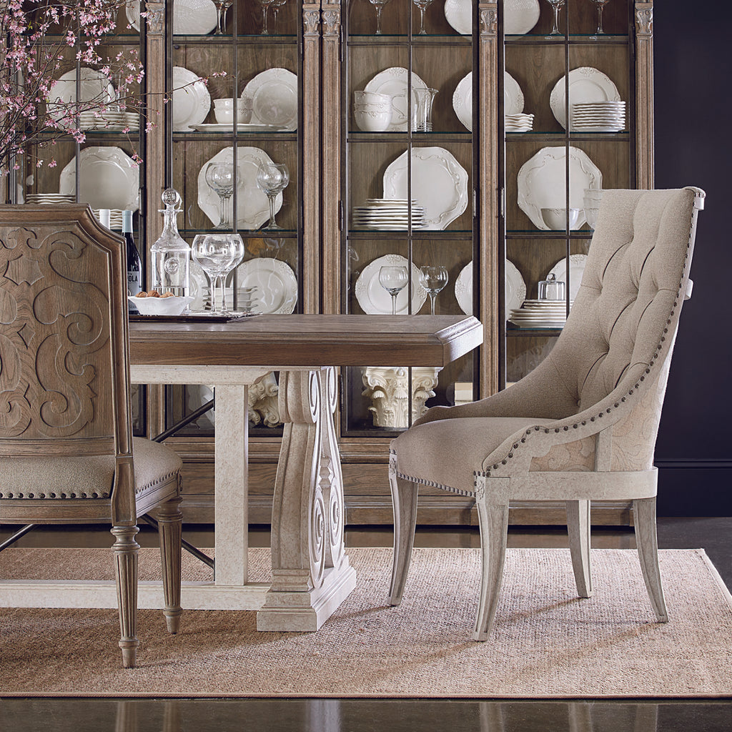 The Arch Salvage Collection from A.R.T. marries the timeless beauty of traditional European architectural detailing with thoughtful functionality for today's living. Beautiful from every angle, the Mills Dining Side Chair back is inlaid with panels of cathedral elm veneer on the front and overlaid with carved wood filigree on the reverse. The neatly tailored seat is detailed with nail head trim; the tapered legs are corner carved and fluted. The Mills Dining Side Chair is available in Parch, a light open-grained finish, or Cirrus a neutral painted finish that has been rubbed and gently aged by hand. Sold As Set of 2.