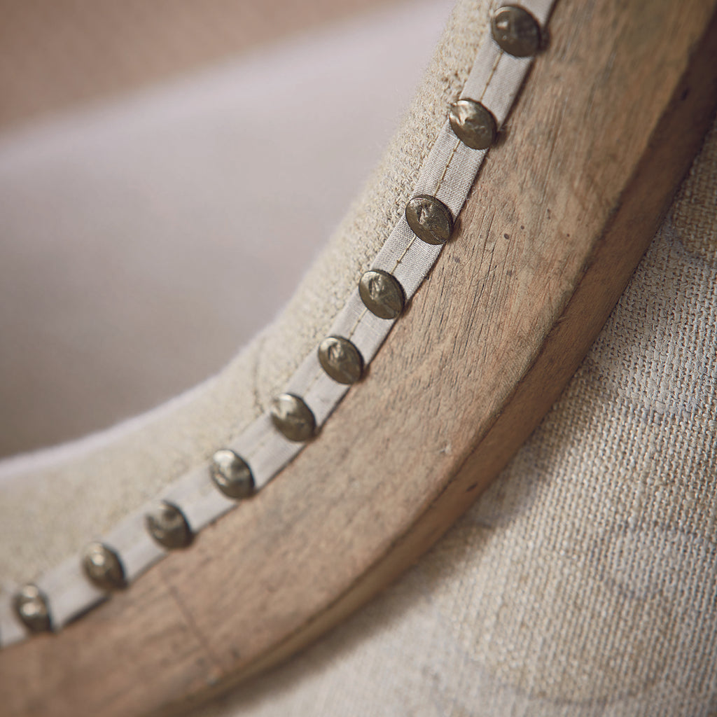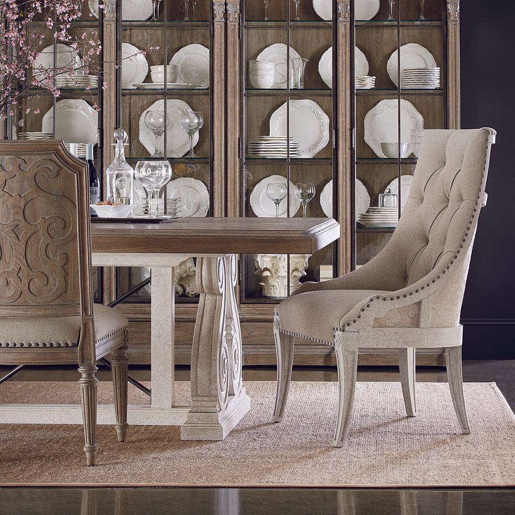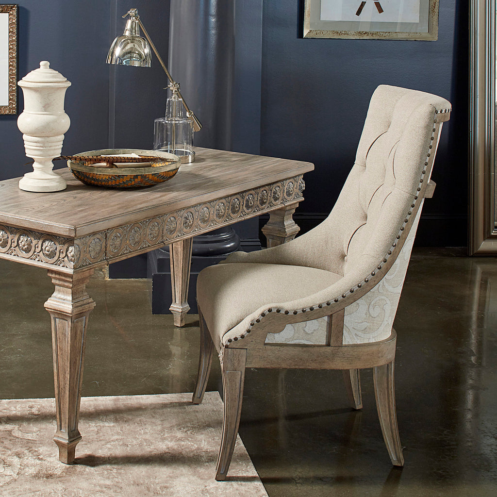 The Arch Salvage Collection from A.R.T. marries the timeless beauty of traditional European architectural detailing with thoughtful functionality for today's living. The generously button tufted front of the Reeves Host Chair contrasts beautifully with the printed fabric wrapped around the back and overlaid with an exposed wood frame. Both front and back of the lofty chair are detailed with hand applied nail head trim.
