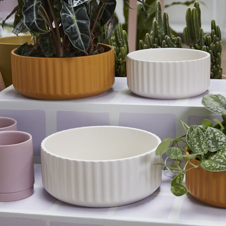 The large ribbed Beam Bowl elevates any succulent or cacti grouping & brightens indoor or outdoor spaces. Watertight with vertical ridges & a hand-glazed matte finish, this modern piece can accommodate several 4-inch plants & looks nice layered with decorative stones & fun plant sticks.