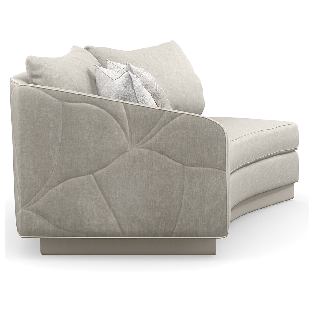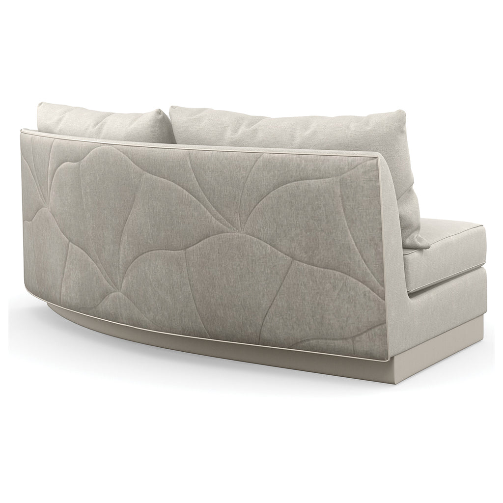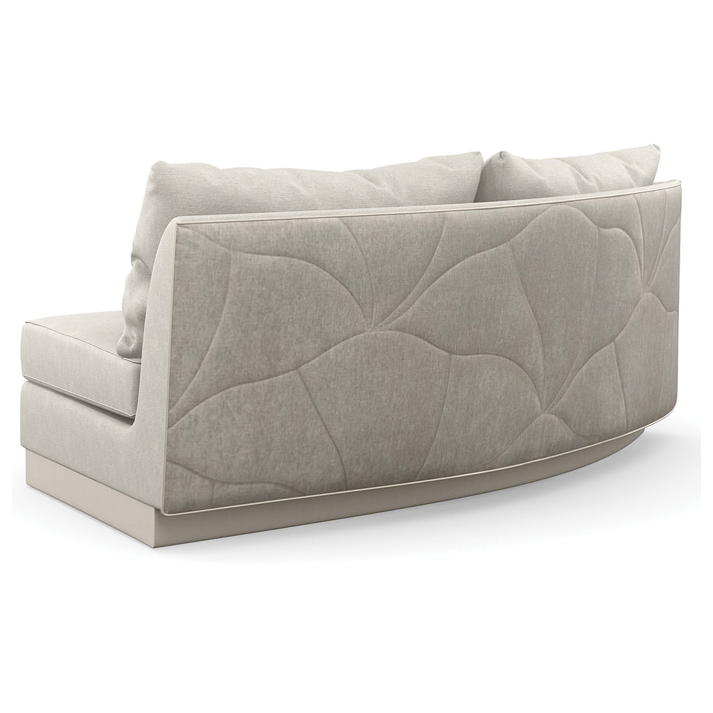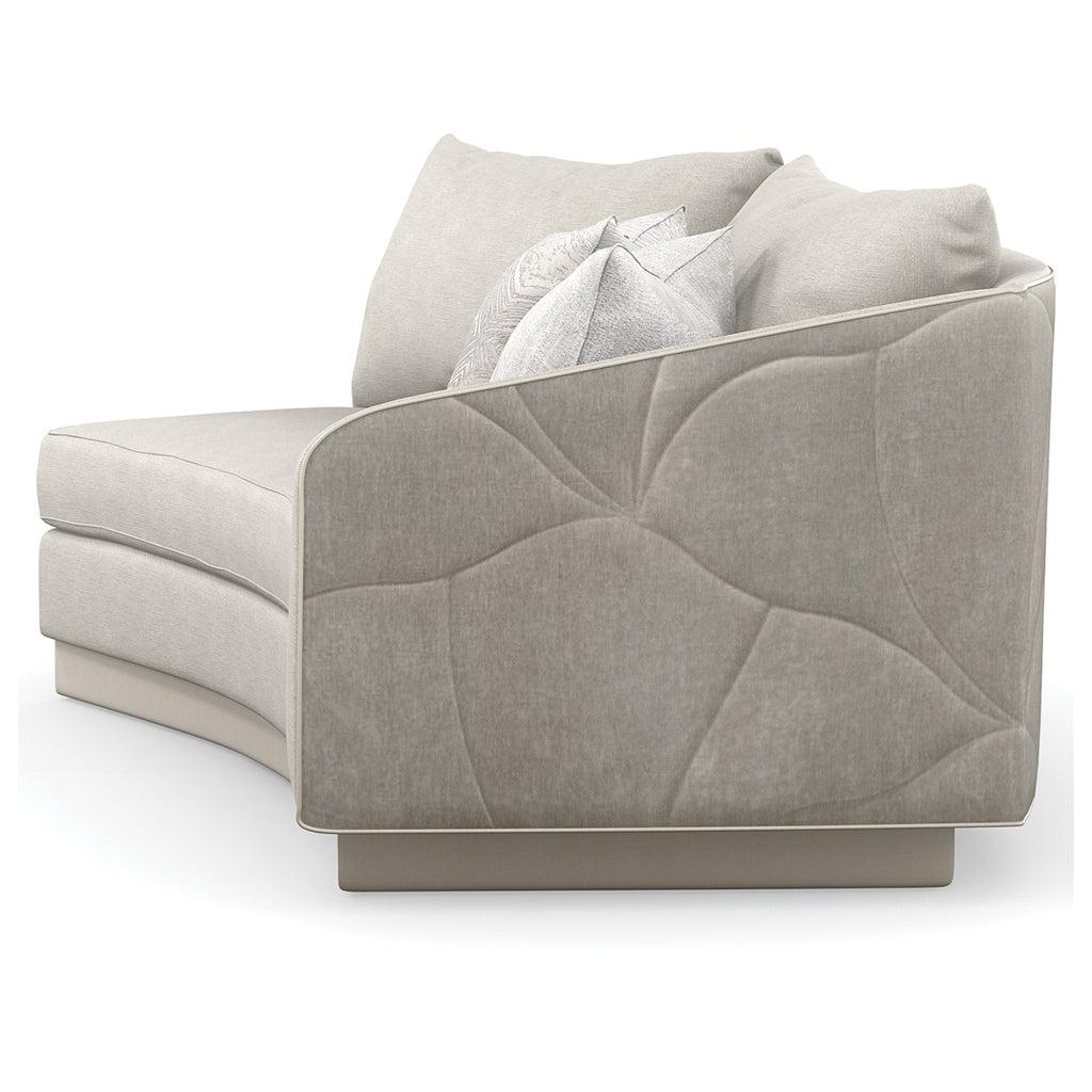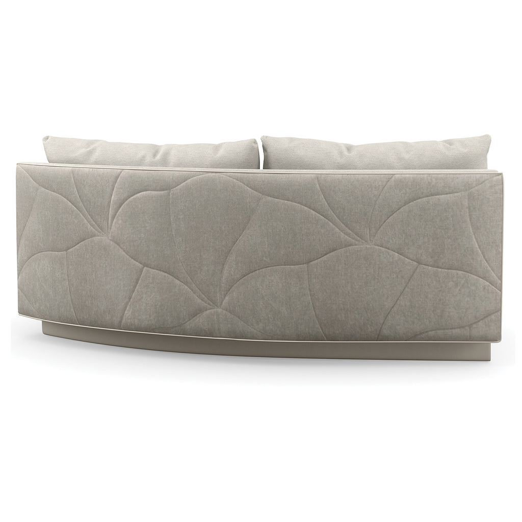Free-flowing and organic, Fanciful’s soft curves are artfully accented by a quilted ginkgo leaf pattern, fanning out along the back and sides. Its nature-inspired design adds graphic interest and dimension, complemented by a curved plinth base wrapped in pearl vinyl. Expertly tailored in tonal gray performance fabrics, inside and out, and trimmed in contrast welt. For a finishing touch, we’ve added accent pillows in soothing neutral hues and a subtle pattern. Pair with the matching Fanciful swivel chair.