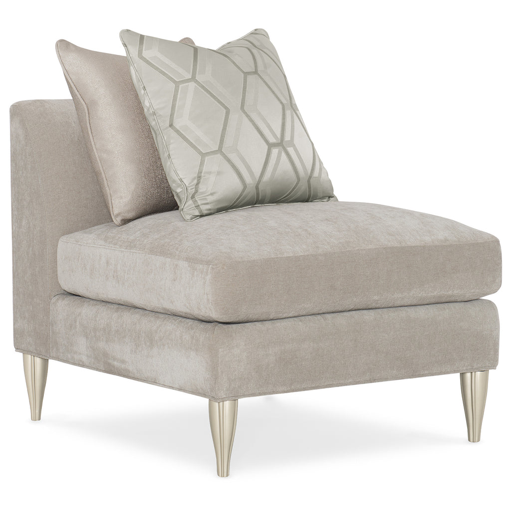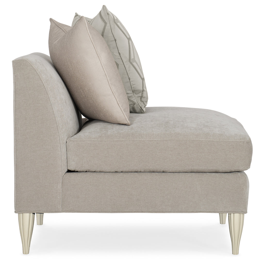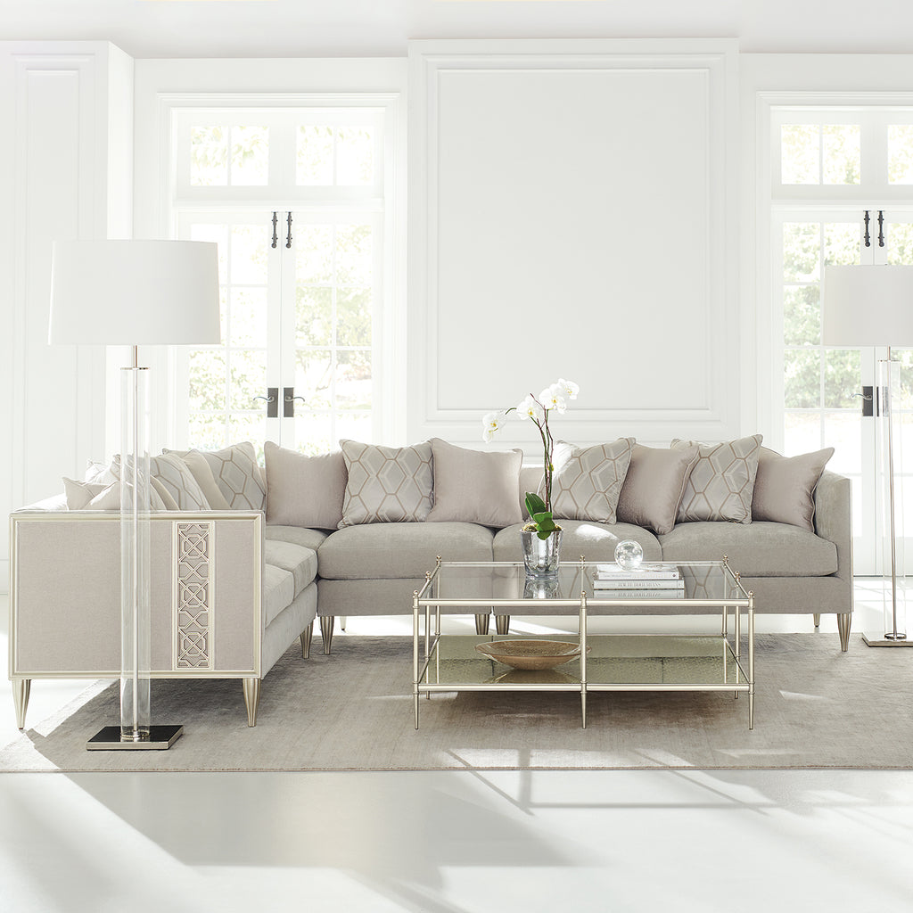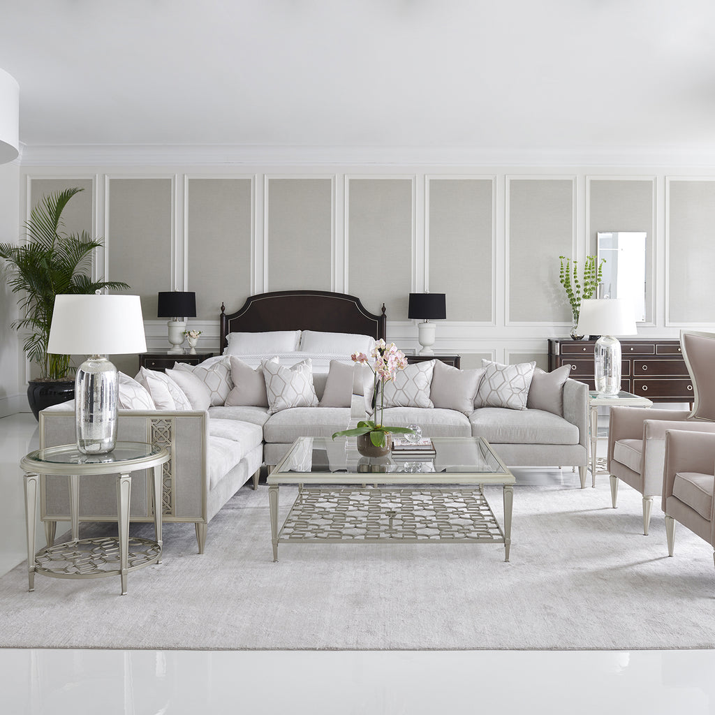 Create your dream seating area with the customizability of these elegant seating segments featuring exquisite fret work. Exceptional from the outside in, these inspired pieces feature inset carved fret panels inlayed into their outside backs. This one-of-a-kind fret pattern was inspired by a narrow castle window and the lattice work designed to let in air and light. Finely upholstered in an exquisite fabric, it offers unending style and a supportive eight-way hand-tied seat. Soft Silver Paint adds a touch of shimmer to its paneled details and fluted feet.