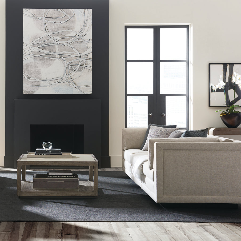 Casually elegant, this fully upholstered sectional is the epitome of today's Modern Fusion lifestyle. Its versatility allows for an unlimited combination of two distinctly designed pieces to create just the right live in sectional sofa for any home. All pieces are perfectly sized and deeply comfortable, tailored to perfection in a neutral, menswear-inspired look with a textured tweed pattern that’s touchably soft. Contrasting accent pillows add additional style, fashioned in a deep gunmetal grey in both velvet and fine corduroy-like styles, as well as a contemporary styled black and white herringbone stitch. A cut-out boxing design around the outside back and a recessed wood plinth base in Simply Black complete the sectional's distinctive aesthetic style.