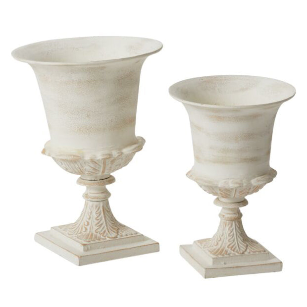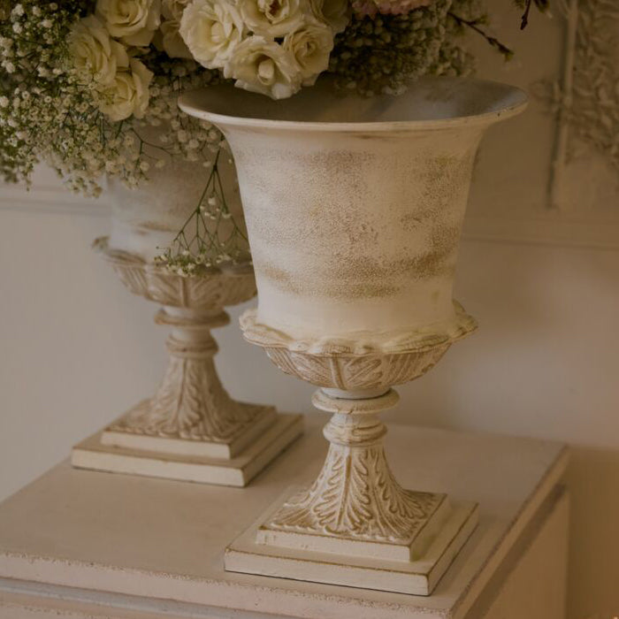 Beautifully striking yet down to earth with its slightly distressed warm white finish, the metal Chapel Urn offers a timeless, versatile spot for florals to shine. Featuring a square base, dimensional leaf details on the body & gold undertones, this urn is a classic piece for wedding, event, holiday, or everyday displays. A large basin holds lots of water for stems, while a floral dish can fit on top or a container can stay hidden inside.
