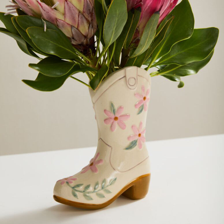 This boot is made for sittin' pretty, especially filled with a small bouquet of florals or desk accesories. The cream colored ceramic Cowgirl Vase features a glossy finish & dimensional flowers, green leaves, & a tan sole. With a classic boot shape & details, this fun piece livens up any styled shelf or desk with its Southern belle charm.