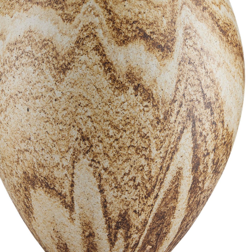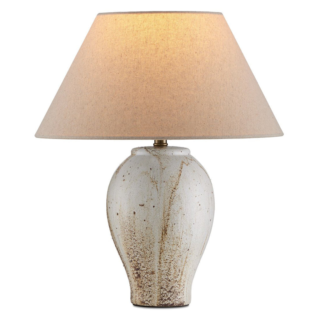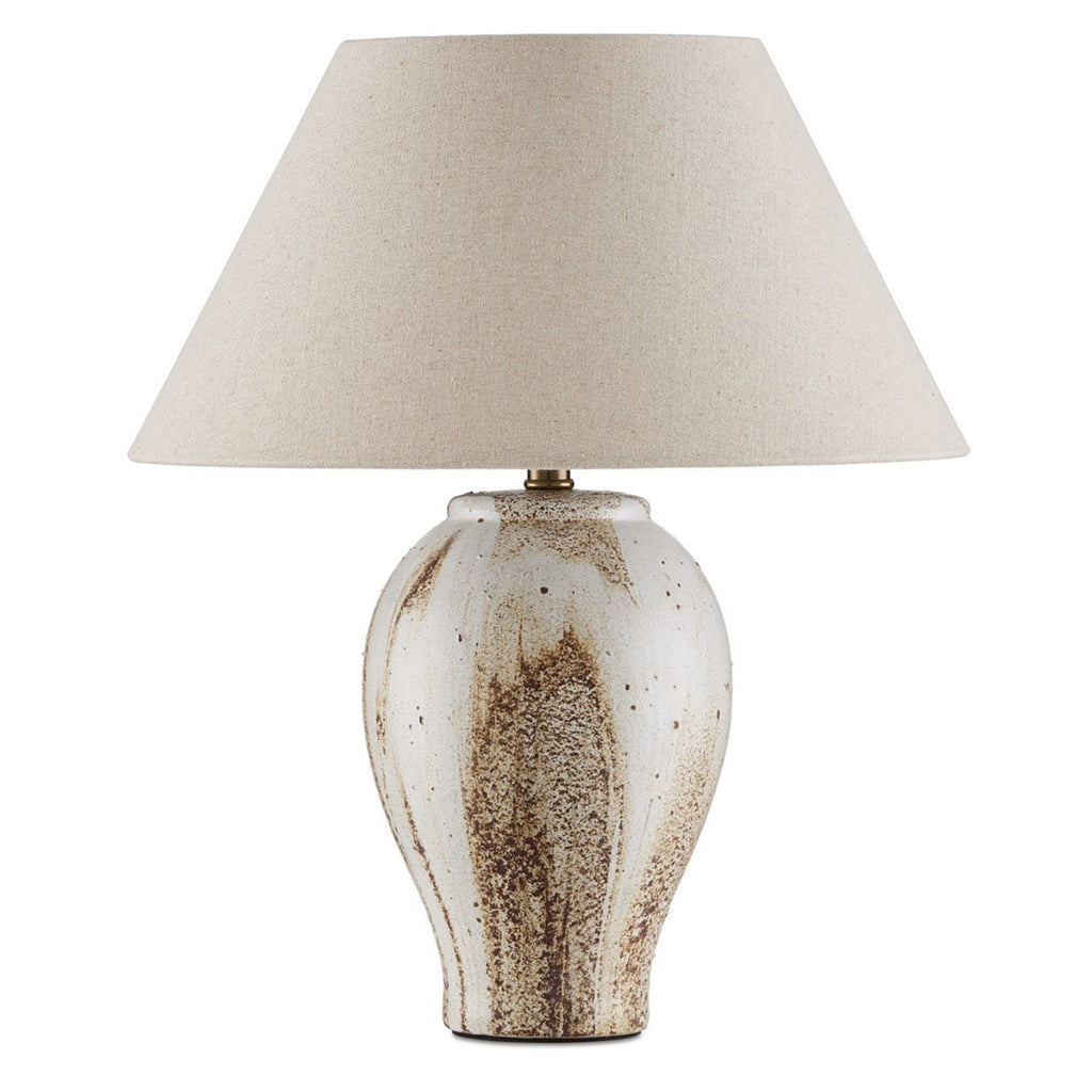 The Currey & Co Latte Beige Table Lamp is made of ceramic in a mix of beige, off-white, and brown glazing that mimics the way cream swirls into coffee. Because glazing ceramic is an artisanal process, this design will vary from piece to piece. The warmth of the empire shade when the lights are switched on draw out the tan tones in the lamp's body.