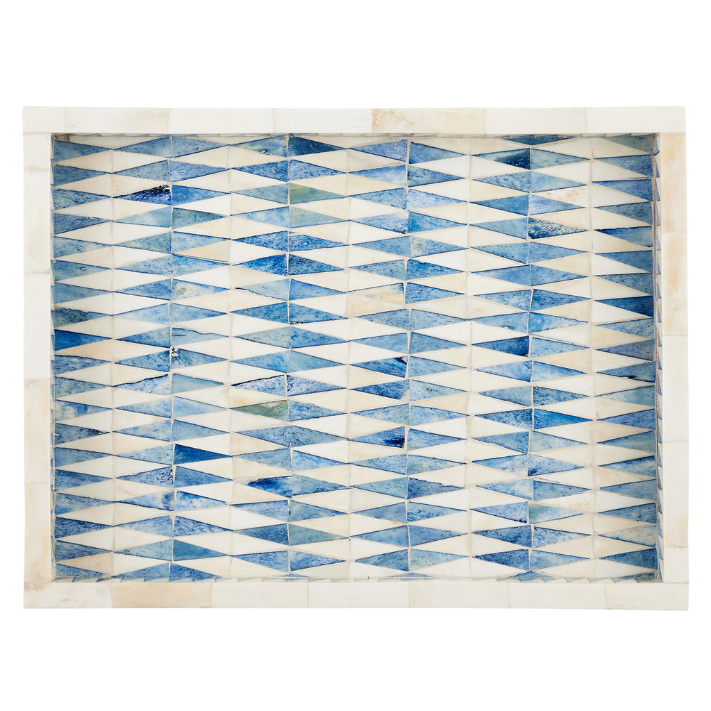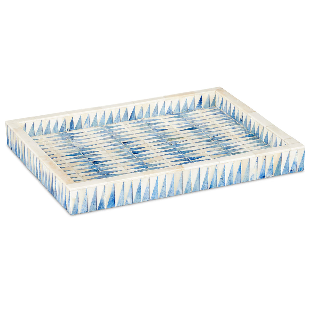 The Currey & Co Nadene Tray is a decorative tray made of alternating colors of bone. The jagged pattern is created when blue and ivory colored bone is hand-applied to the surface, which makes the blue tray an artisanal accessory that packs a textural punch. Place this lovely decorative accessory on a kitchen island or a buffet and it will be a dynamic accent whether or not it holds any meal-specific elements.