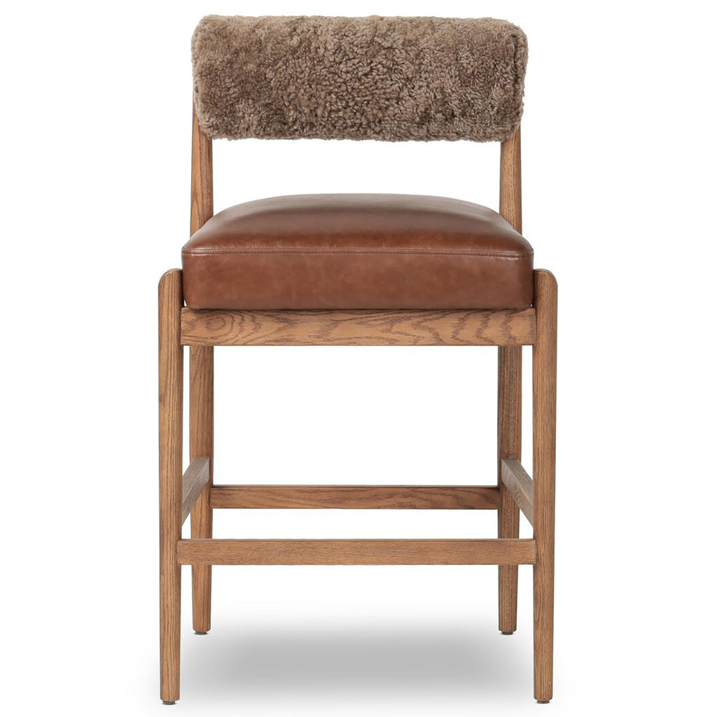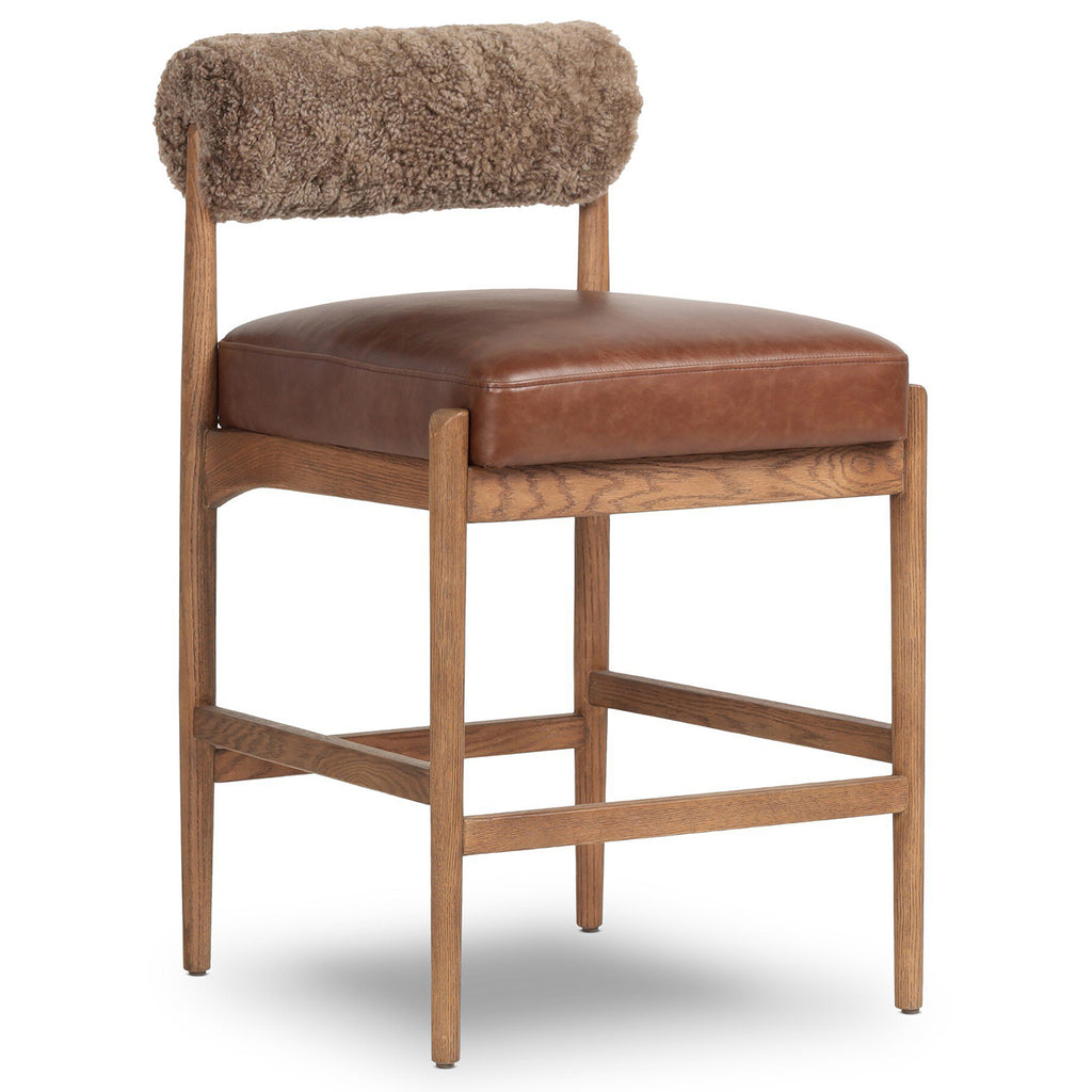 Bring mixed materials to the counter. Solid oak, top-grain leather and soft shearling fuse for a playful update to midcentury and Seventies styling.