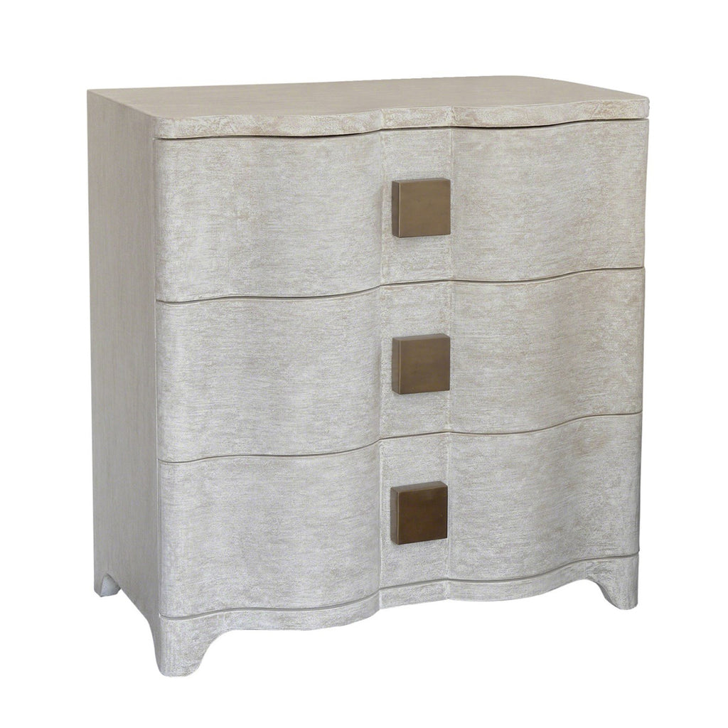 Carefully hand-wrapped in fine Belgian linen and topped with layer upon layer of a delicate paint glaze, this collection is built of solid white oak and finished with customized antique brass hardware. A technique that fell out of favor for many years, fabric wrapping furniture is an exacting art that begets pieces crafted in exceptional detail, rendering them an exercise in tactile exploration. The result is a distinctively textured furniture piece that renders a softer feel to interiors while maintaining a touch of historical influence.