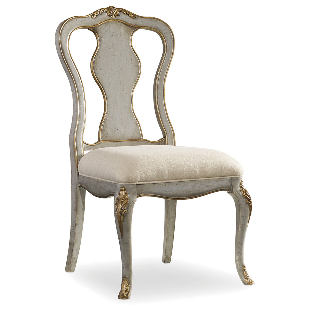 Gracefully shaped and designed, the French-styled desk chair has a soft gray finish with gold accents, cabriole legs and a decorative carving on the top. The Linen Natural fabric is a linen-cotton blend in a neutral color to fit in many decors.