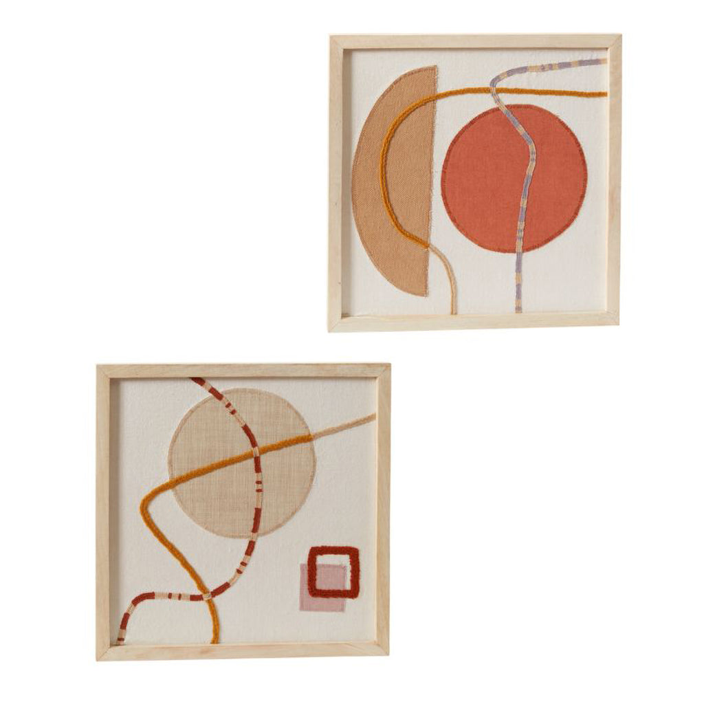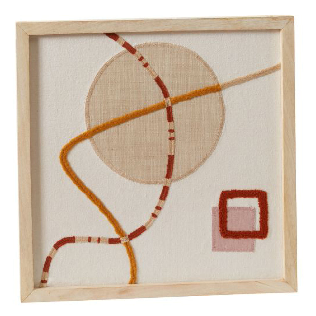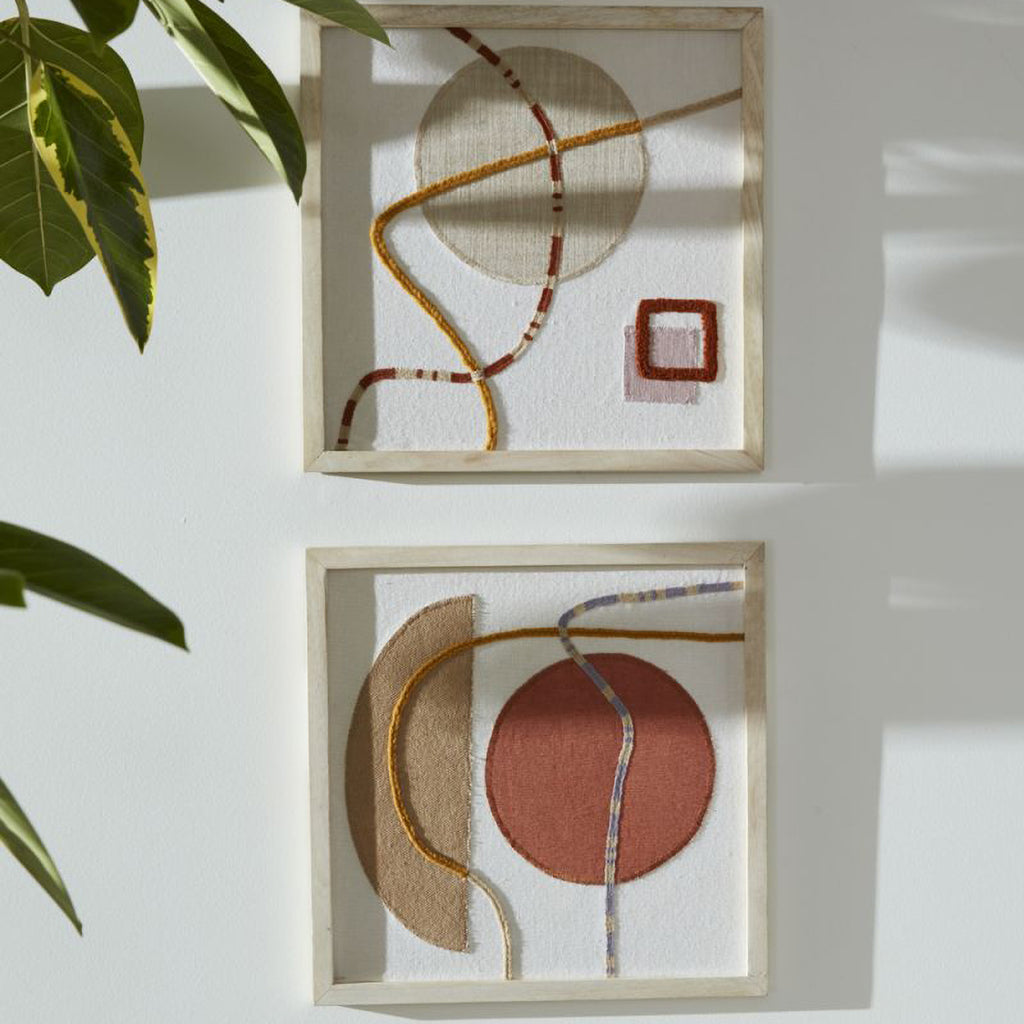 The contrast of colorful, modern embroidered & appliqued shapes on neutral slub cotton makes the Latigo Framed Embroidery a stand-out interior design statement piece & unique wall art. Featuring textural graphic details framed in bleached mango wood, this artwork adds a modern, earthy look to the room. Pair the 2 Latigo styles together for a trendy wall arrangement.