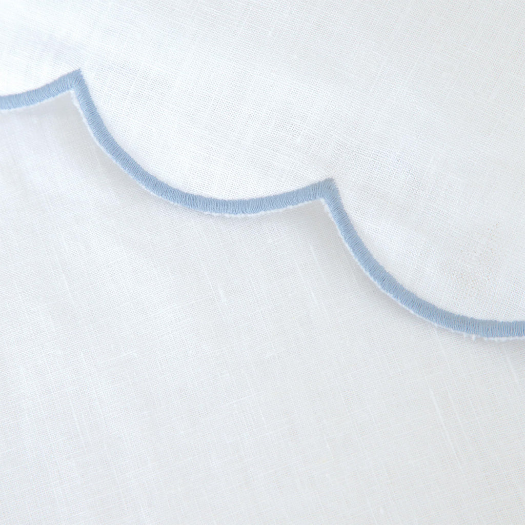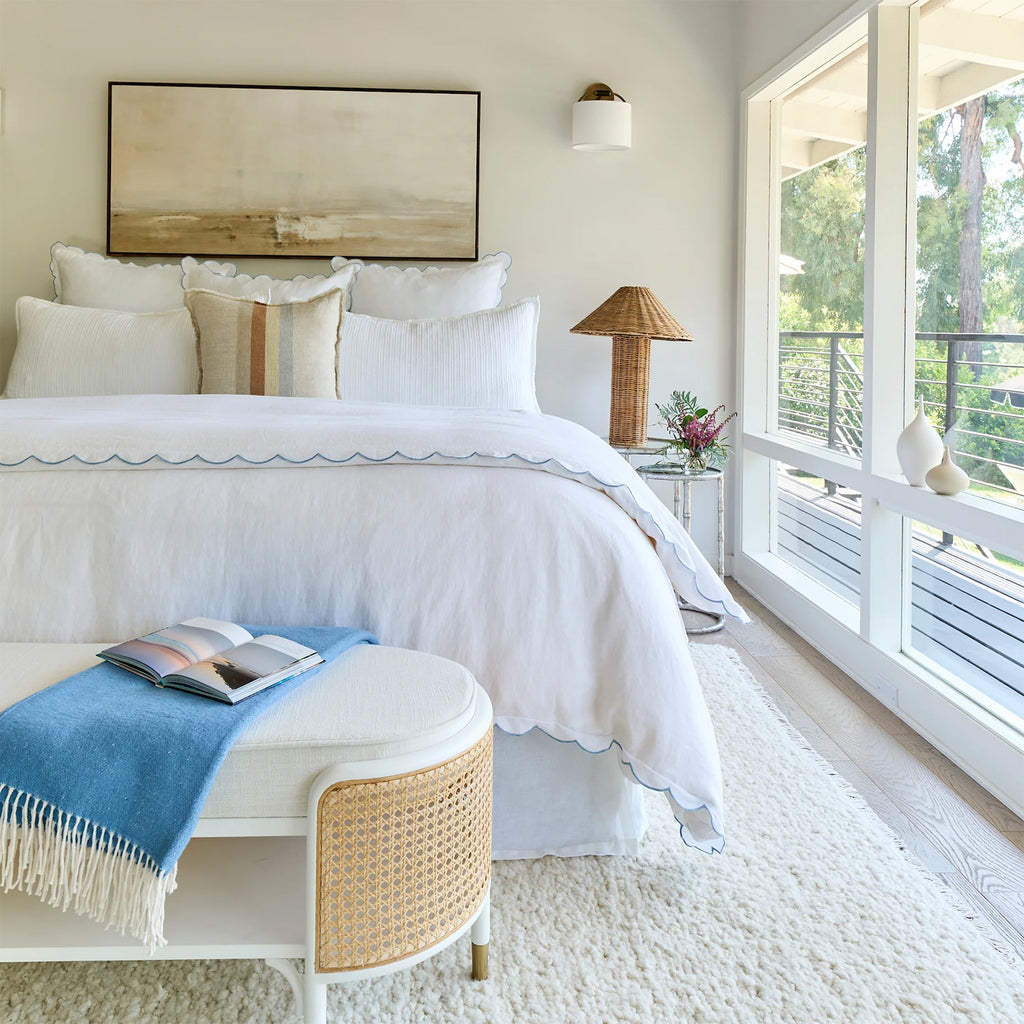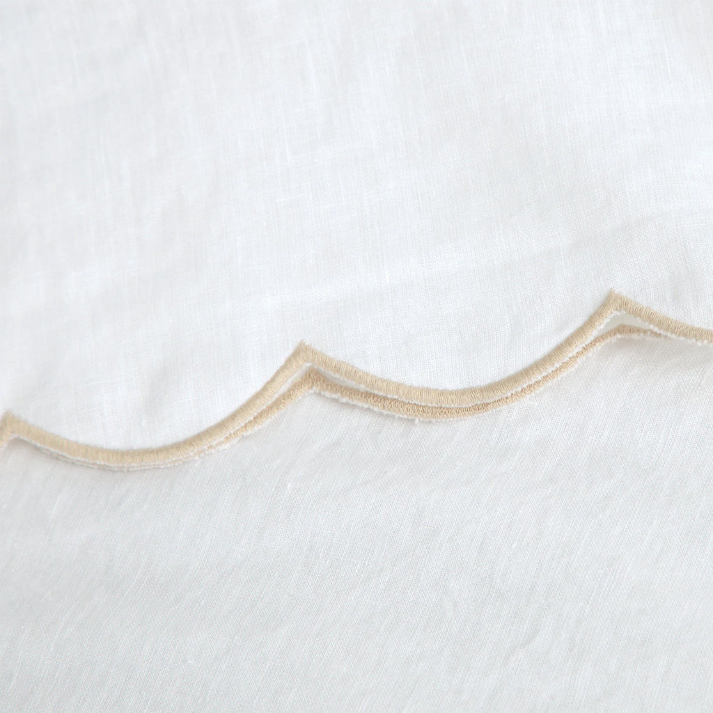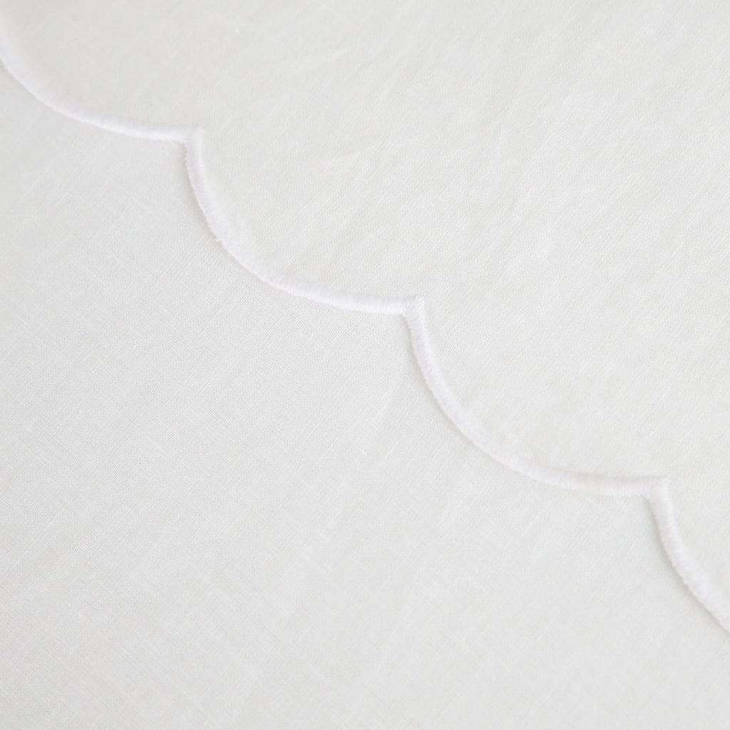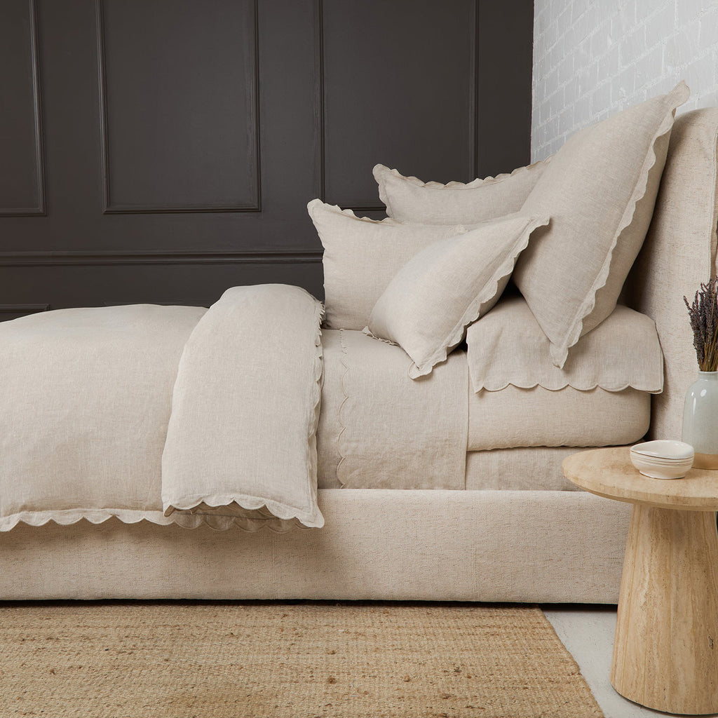 The essence of romantic simplicity. The Pom Pom at Home Kelly collection embellishes our classic linens with delicately embroidered scalloping in a range of soft hues. In the same fabrication as our signature extra-soft linen sheeting, Kelly’s thread embroidery gives each edge dimension along with a hint of color.Kelly’s European flax linen duvet covers and shams are complete with mother-of-pearl closures and inner corner duvet ties, inviting you to lounge in a bed of airy luxury. Scalloped on all four sides, your duvet can be styled with a turndown – no unadorned edges in sight.