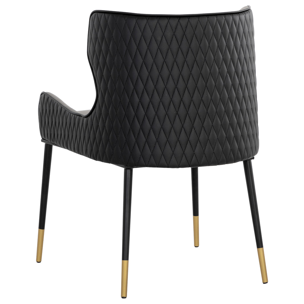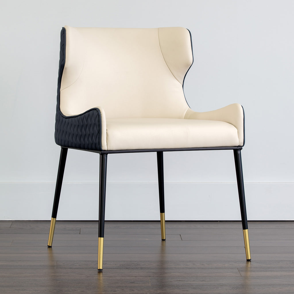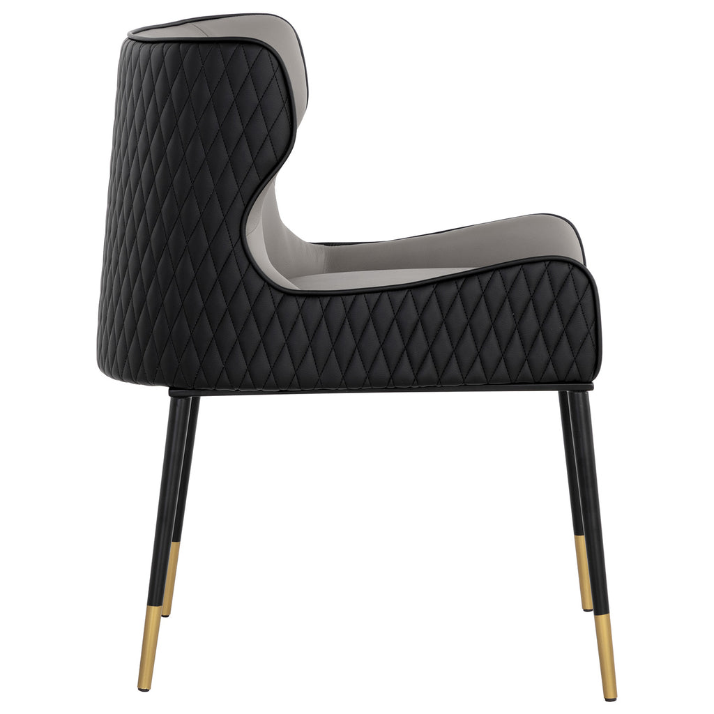 A classic dining chair featuring a substantial seat upholstered in contrasting faux leather. Diamond stitching on the seatback adds a hint of elegance while black wood legs and brushed gold foot caps complete the look.