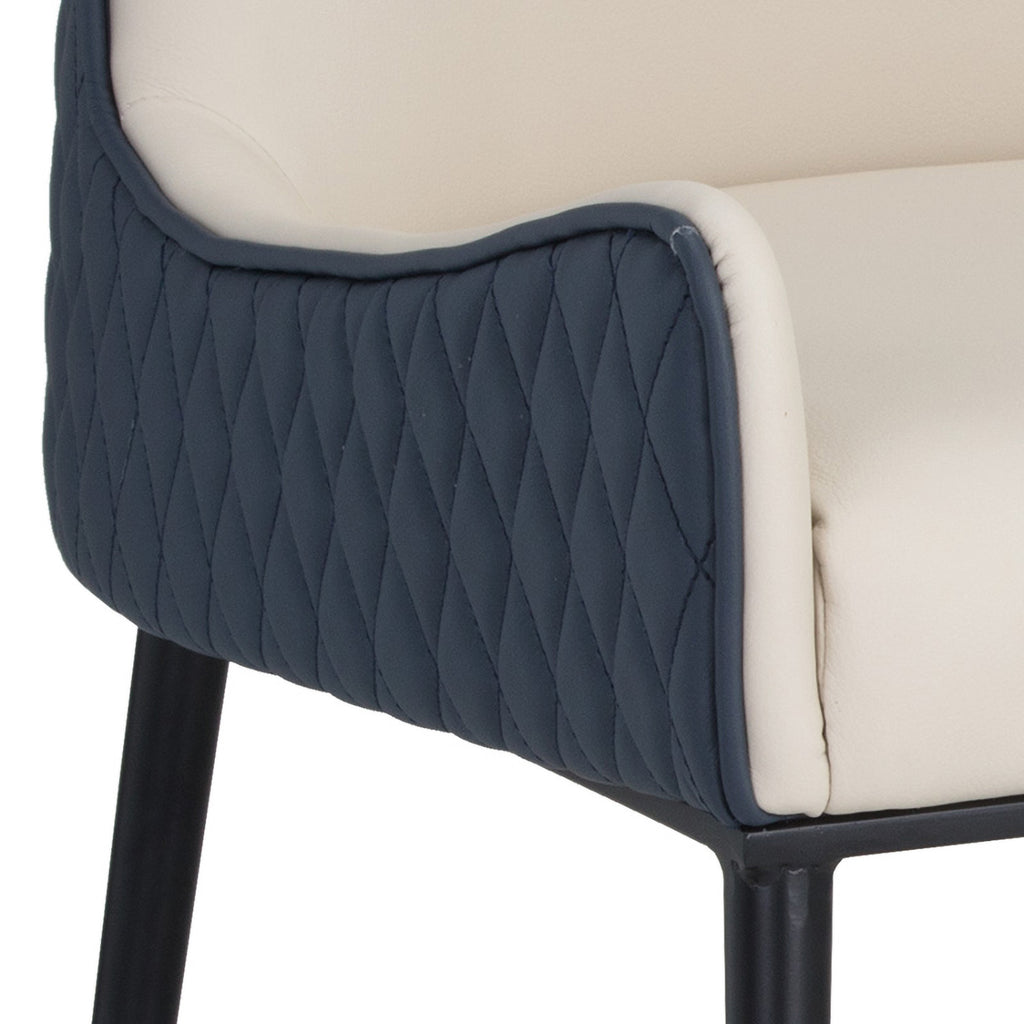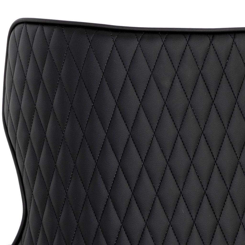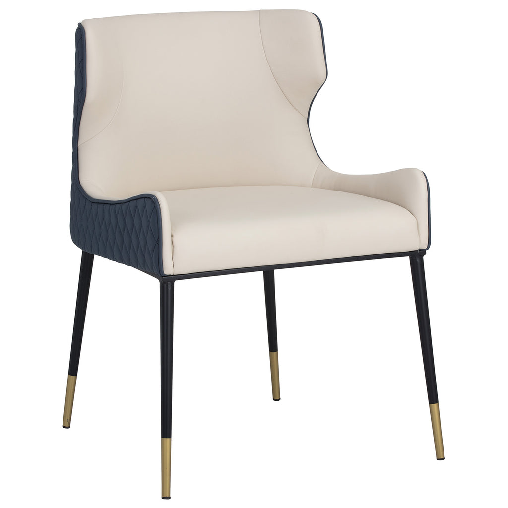 A classic dining chair featuring a substantial seat upholstered in contrasting faux leather. Diamond stitching on the seatback adds a hint of elegance while black wood legs and brushed gold foot caps complete the look.