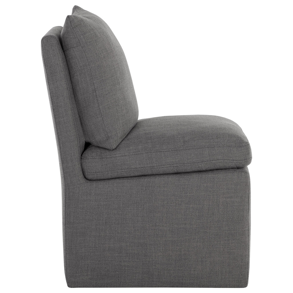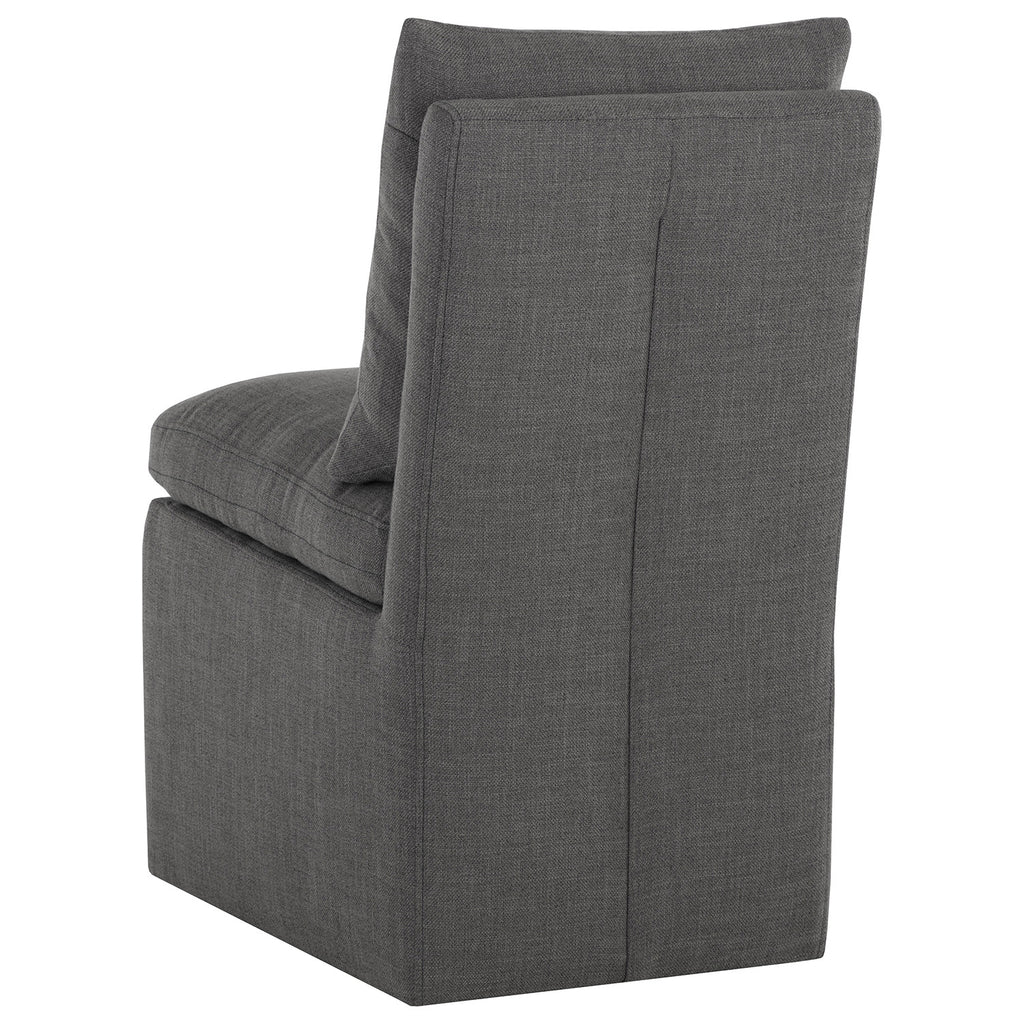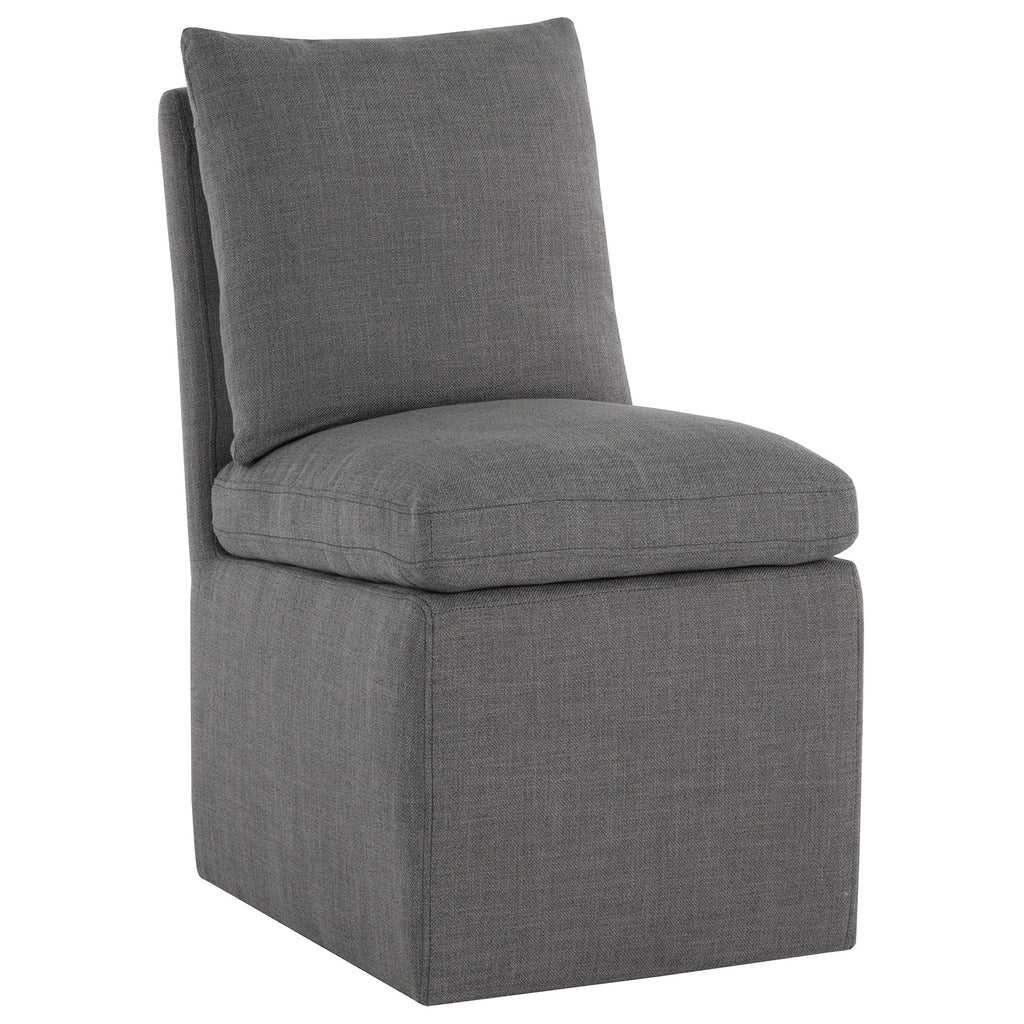 A formal and comfortable wheeled dining chair that is full of classic appeal. Stocked in effie linen and smoke fabrics. Also available in an armrest dining chair version .