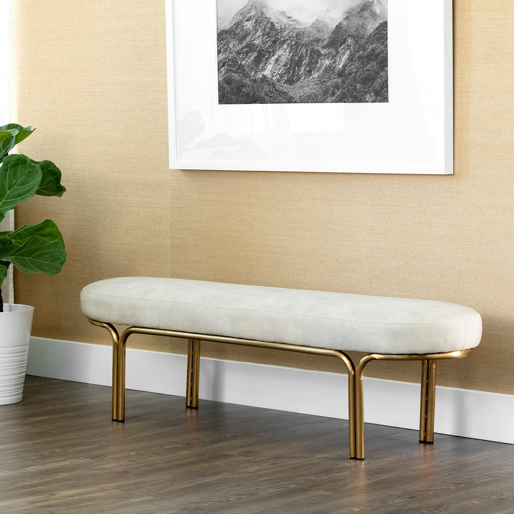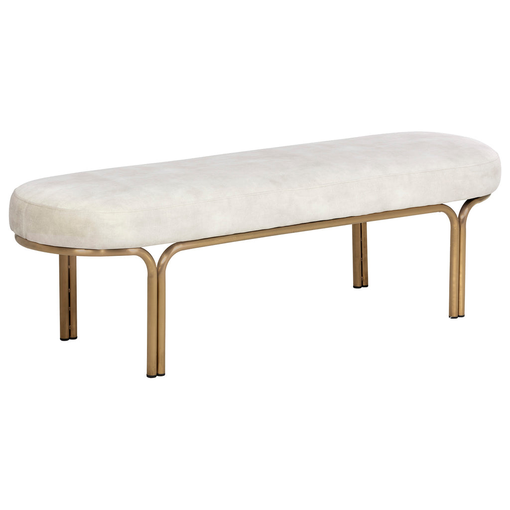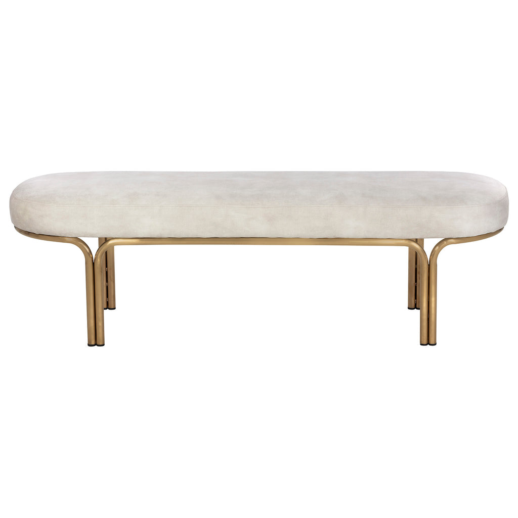 Boasting a classic oval shape, this elegant bench is a stylish and functional addition to any space. Stocked in nono cream and shitake fabrics, and completed with a gold iron frame.