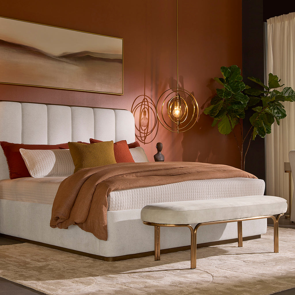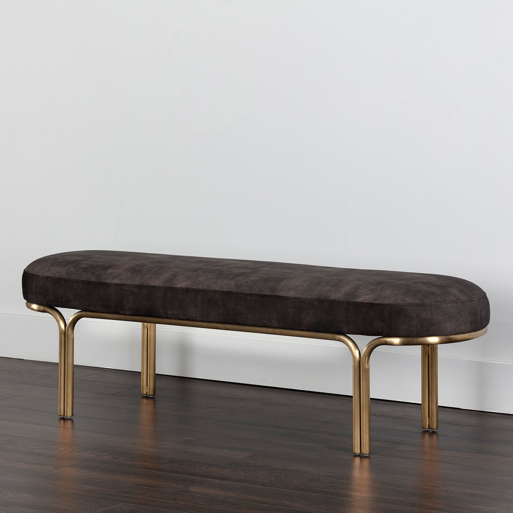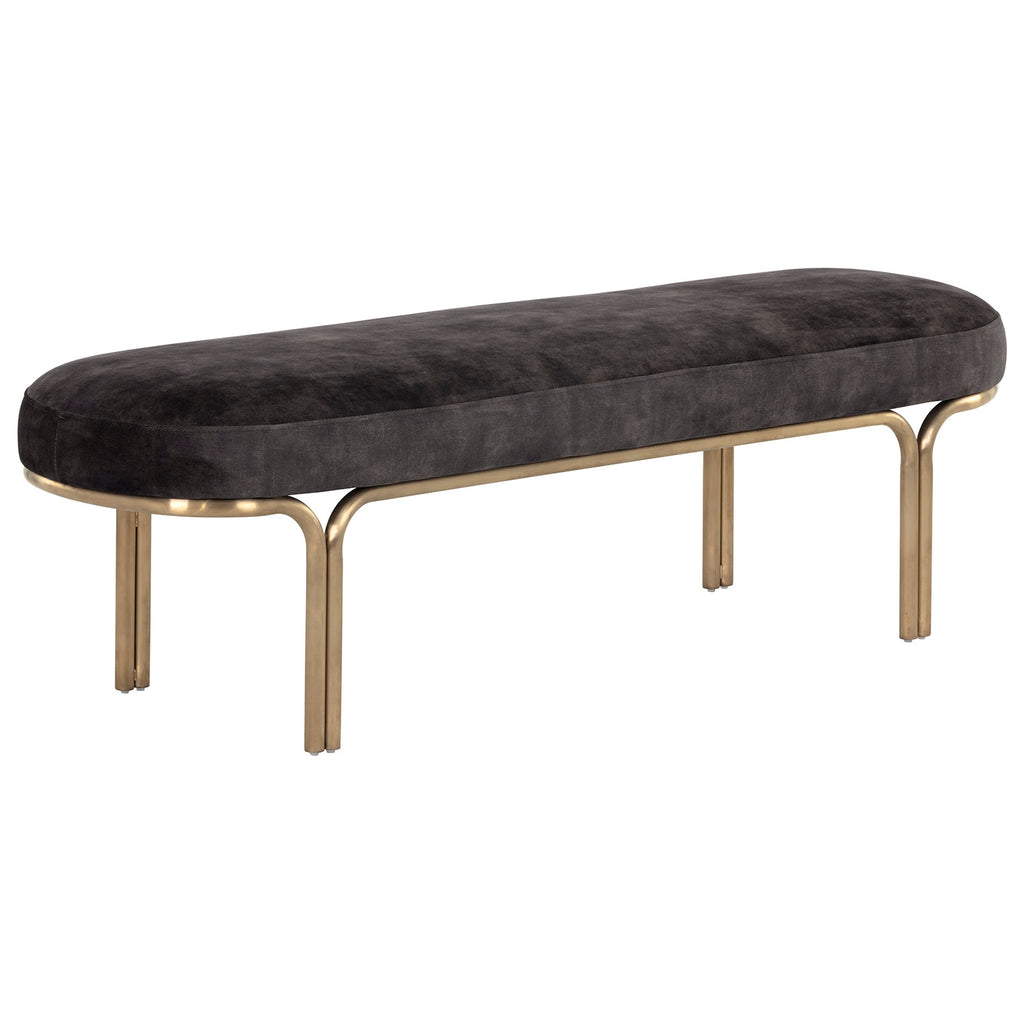 Boasting a classic oval shape, this elegant bench is a stylish and functional addition to any space. Stocked in nono cream and shitake fabrics, and completed with a gold iron frame.