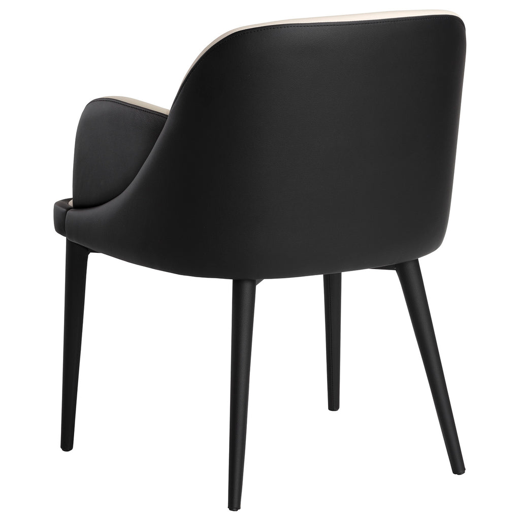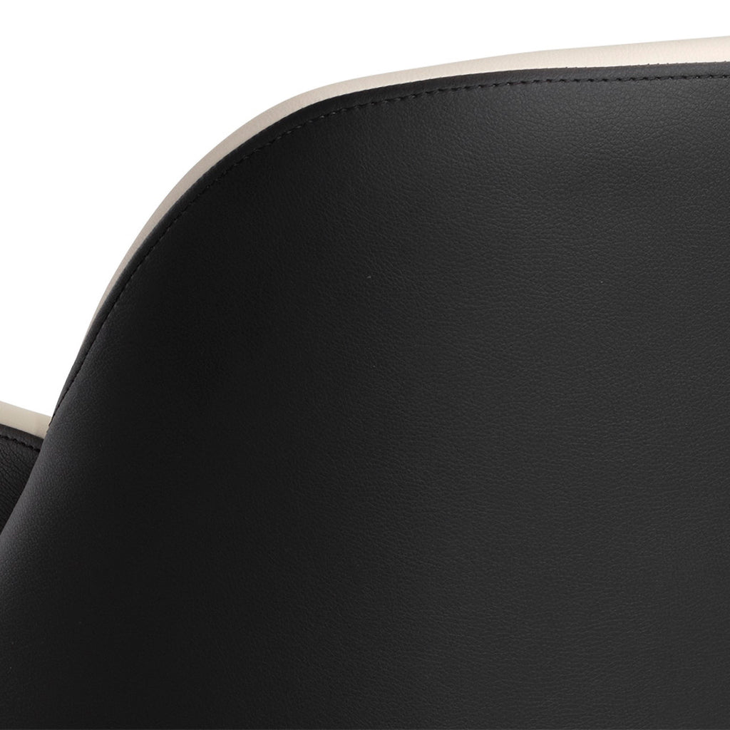 A futuristic dining armchair featuring a modular inspired seat, upholstered in contrasting dillon cream and dillon black faux leather.