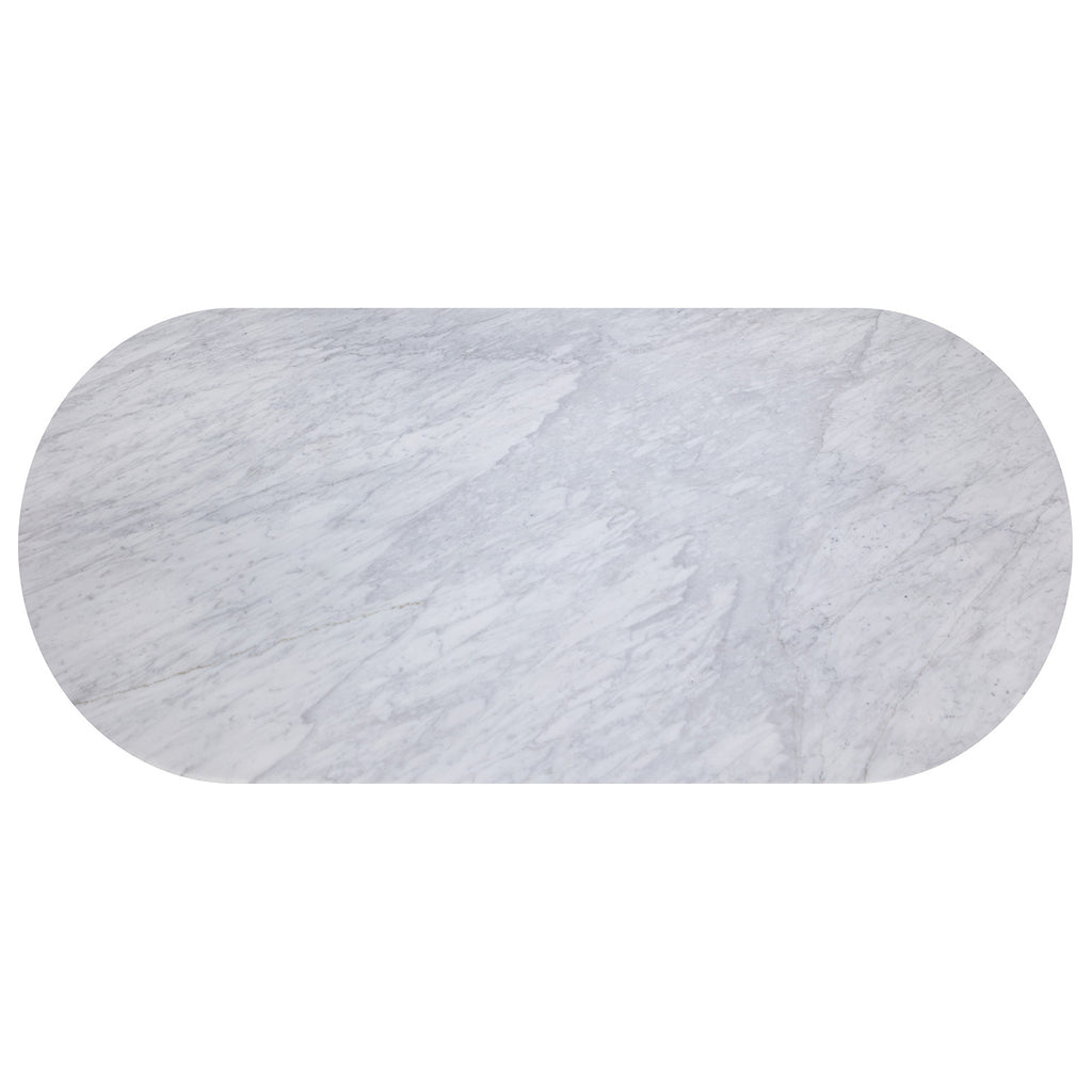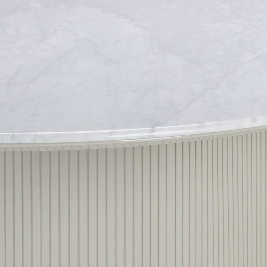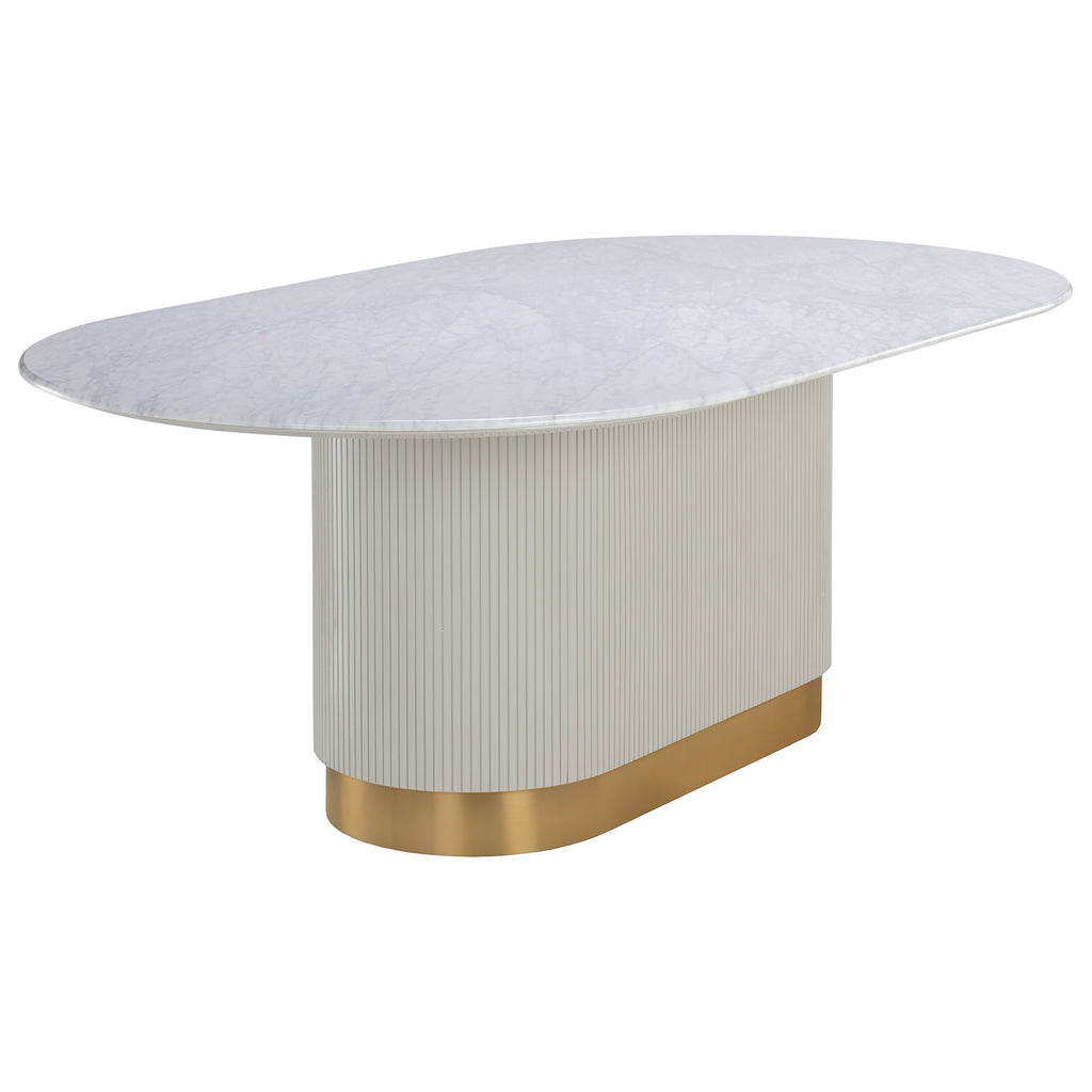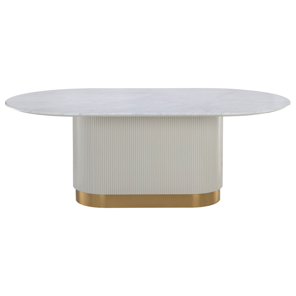 The Paloma Dining Table brings a sculptural spirit to any dining space. The smooth white marble tabletop contrasts with a textured high gloss cream base that features intricate vertical reeding. A gold stainless inlay at the bottom creates added definition. Coordinating lift-top coffee table and sideboard also available.