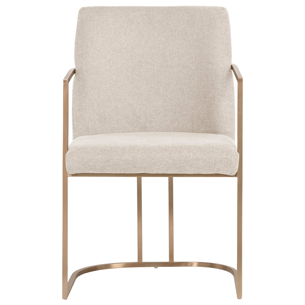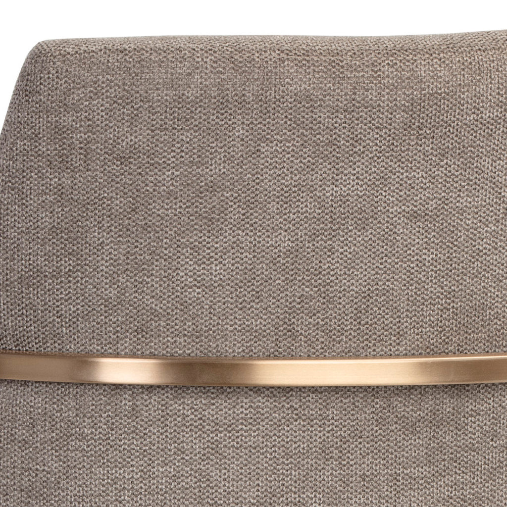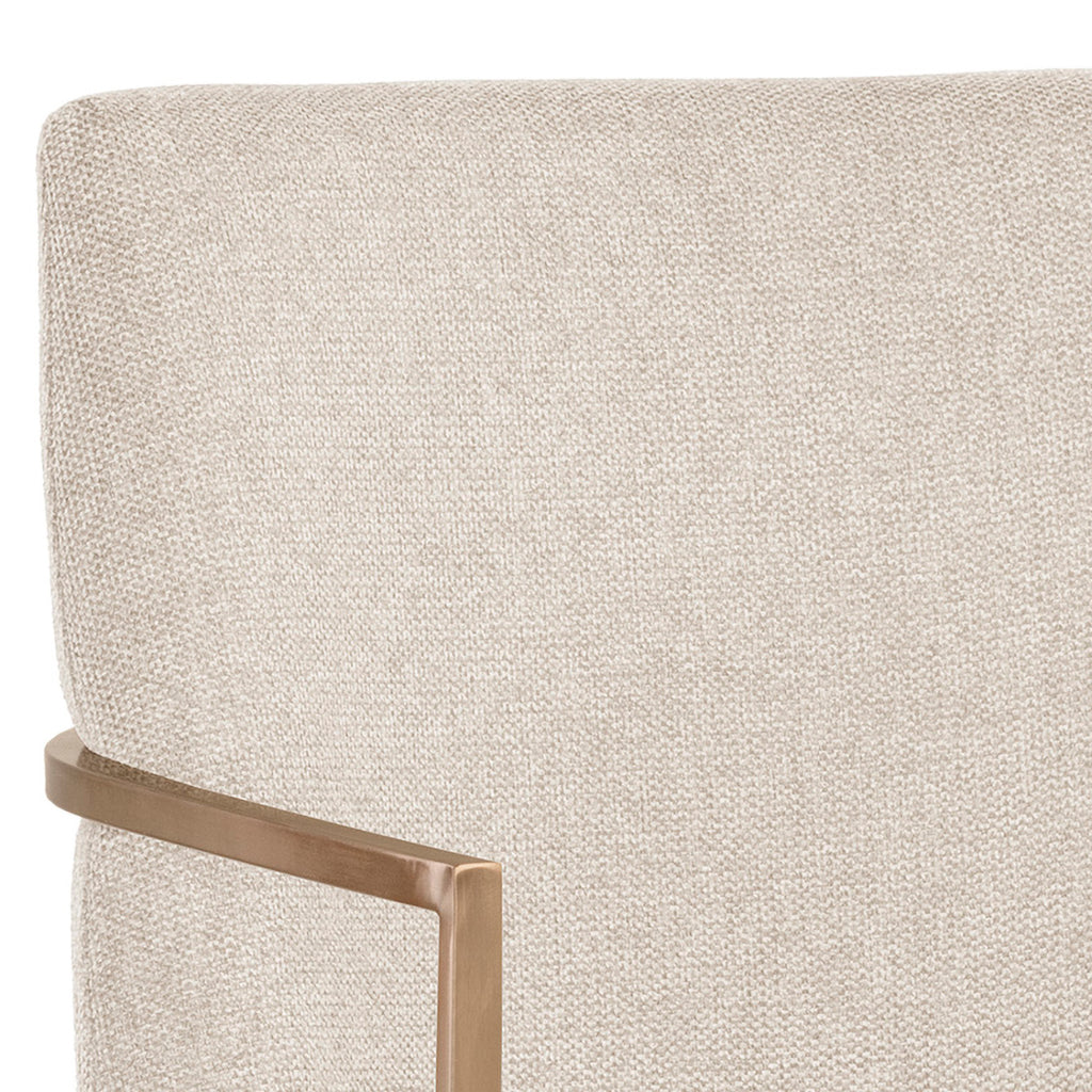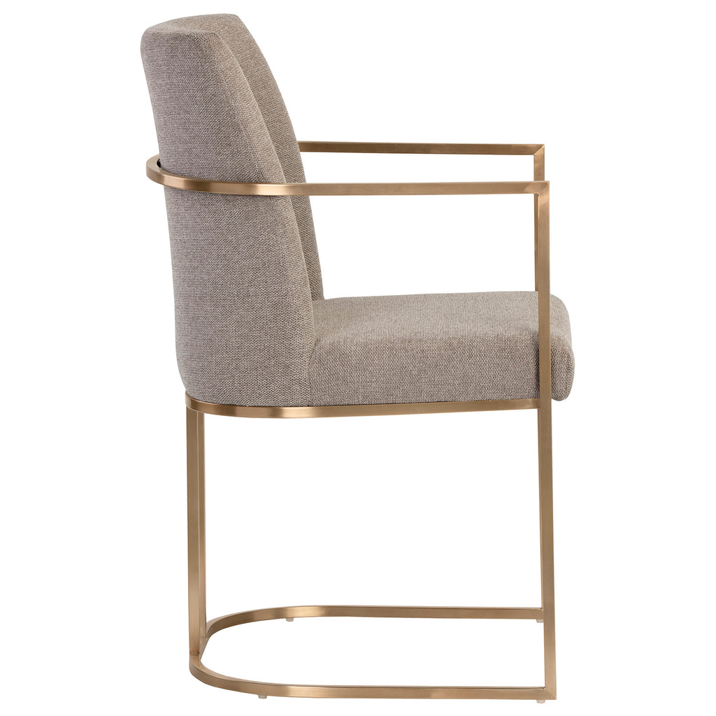 An elegant cantilever dining armchair designed with soft, textured belfast oatmeal fabric and an exposed antique brass stainless steel frame. Can be paired with coordinating dining chair and bench.