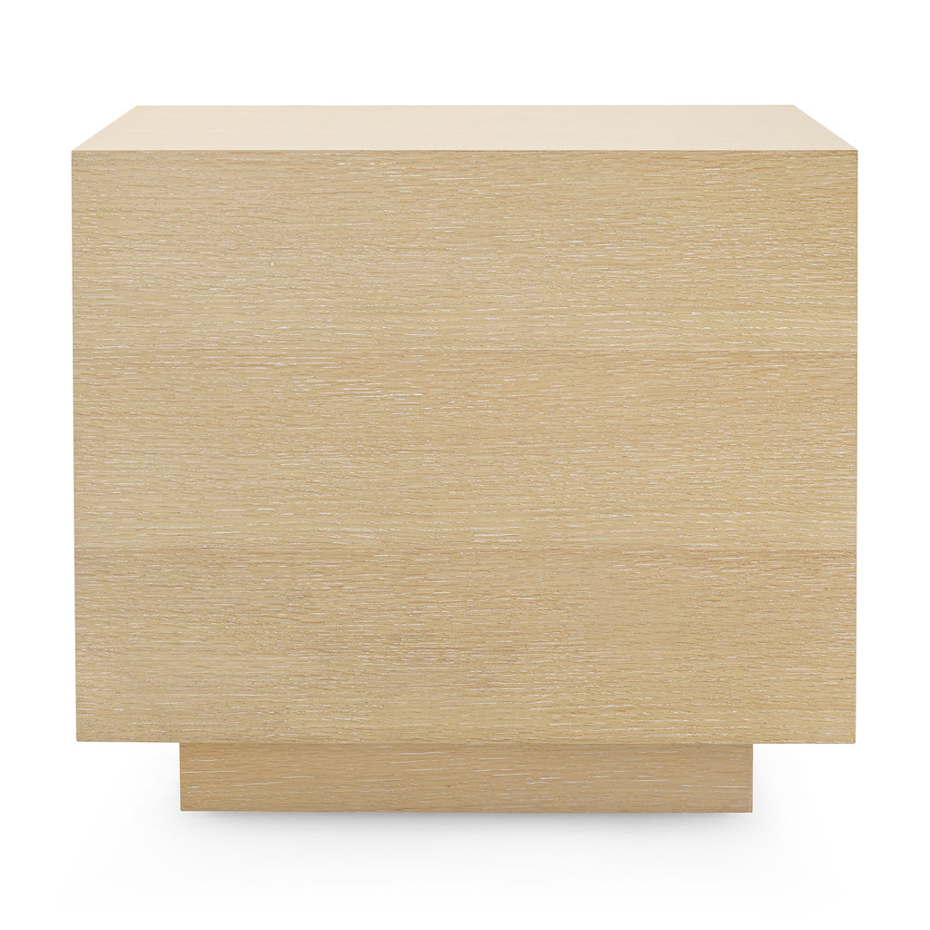 Crafted from solid oak, the Villa and House Simon 3 Drawer Side Table exudes a timeless elegance that will captivate your senses. The organic grain patterns and rich hues of the wood create a warm and inviting ambiance, while the Clear Lacquered Silky Grasscloth adds a touch of refined texture. Designed to make a statement, this side table sits proudly on a platform base of Cerused Oak, showcasing its sleek and modern silhouette. The cutouts, cleverly integrated into the design, not only serve as pulls for the drawers but also expose the same beautiful wood, creating a harmonious and seamless aesthetic. With its low-to-the-ground profile, the Simon Side Table functions perfectly as a side table or a small media console.