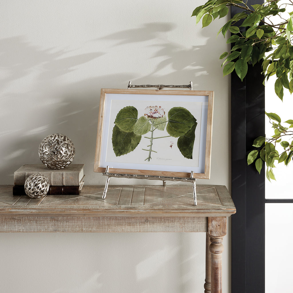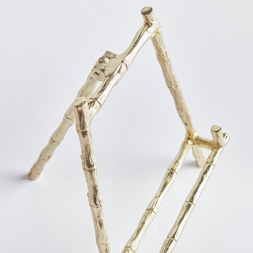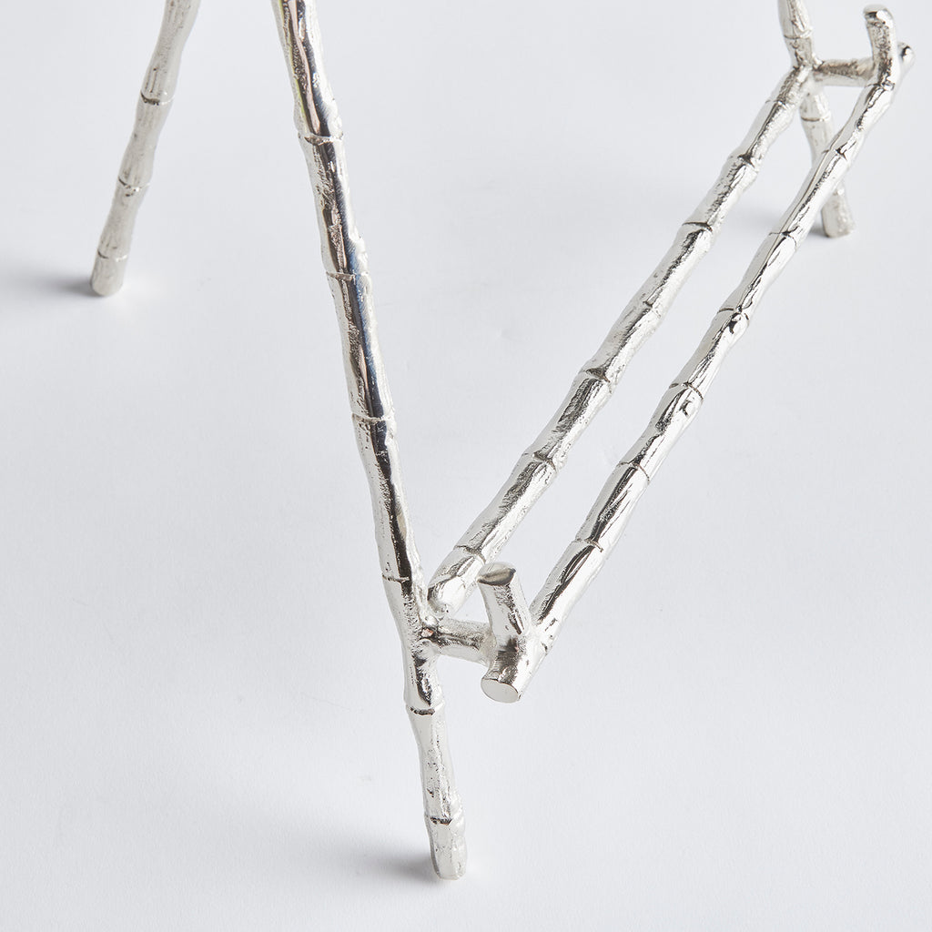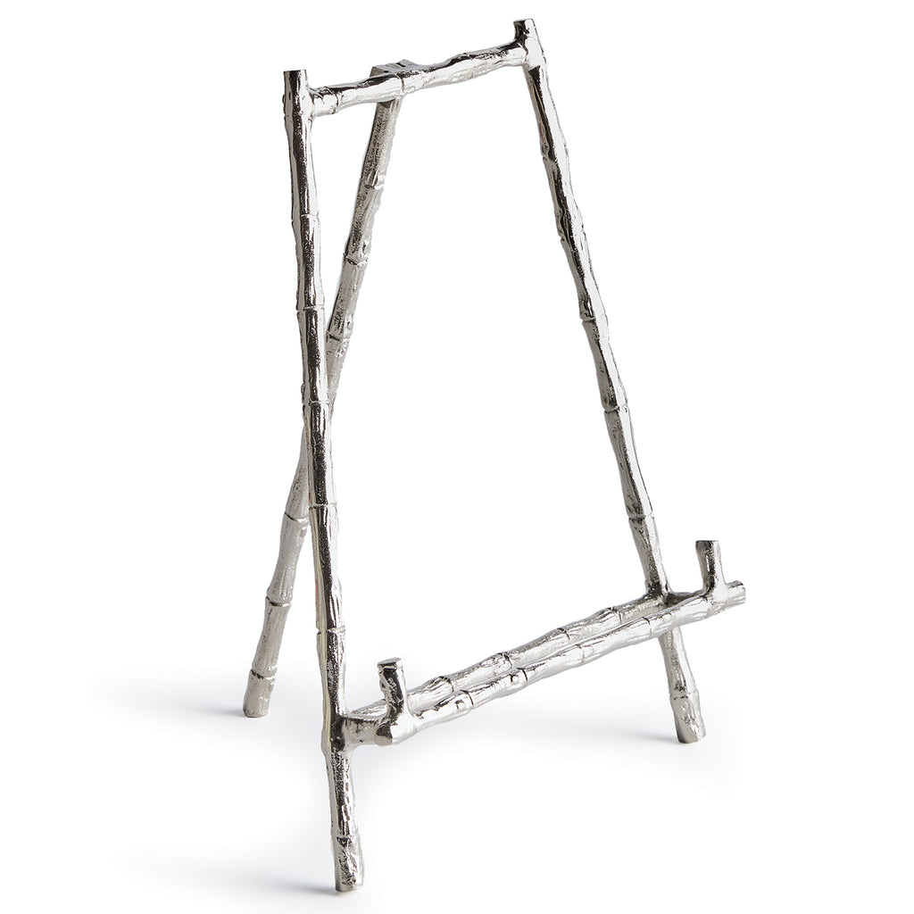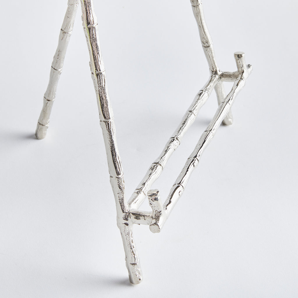 Made to hold platters, cookbooks or a small piece of art, this easel is strong and sturdy. The silver bamboo-like details add a traditional aesthetic.