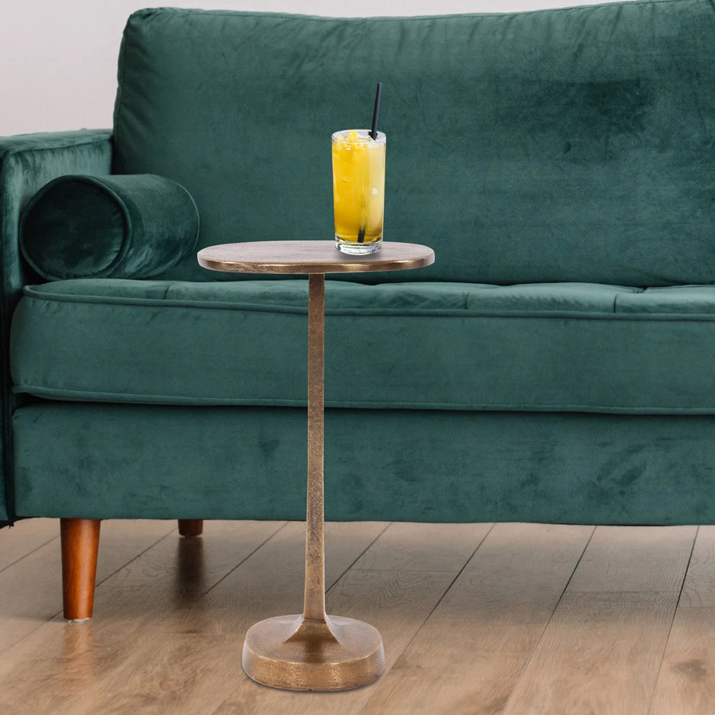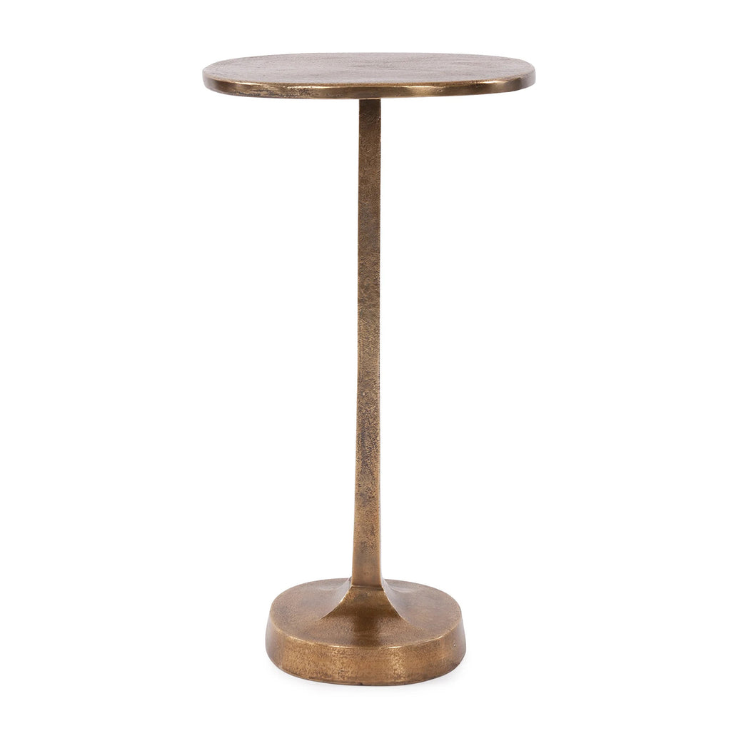 This cast aluminum Martini table will certainly provide the perfect spot to rest your cocktail! The simple frame is fashioned from cast aluminum with a round base and a rounded square top. The piece is enhanced by a rich brass finish. Its small footprint makes it the perfect table for small spaces