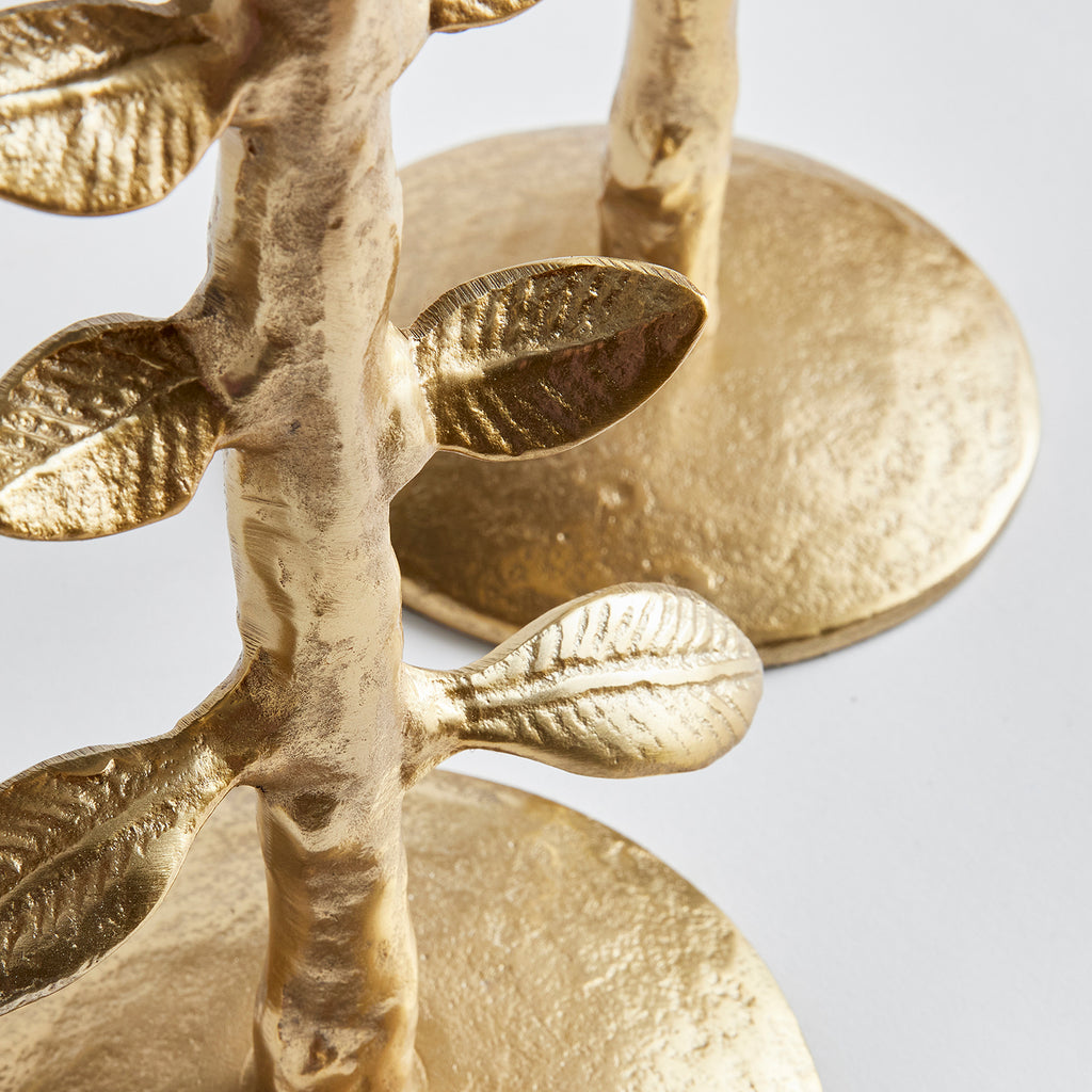 In a heavy cast aluminum, these nature-inspired taper holders sprout up from the surface in a loose, sculpted style. A whimsical way to elevate your candles.