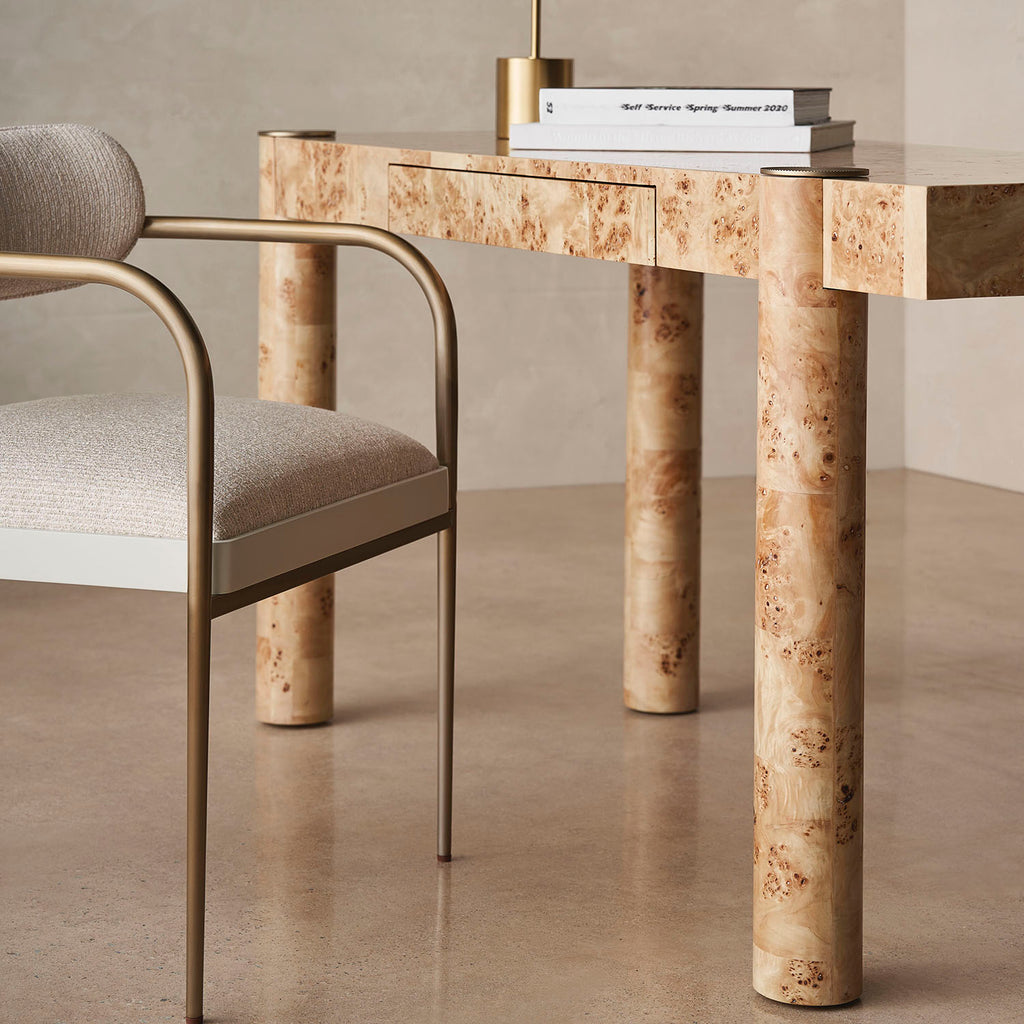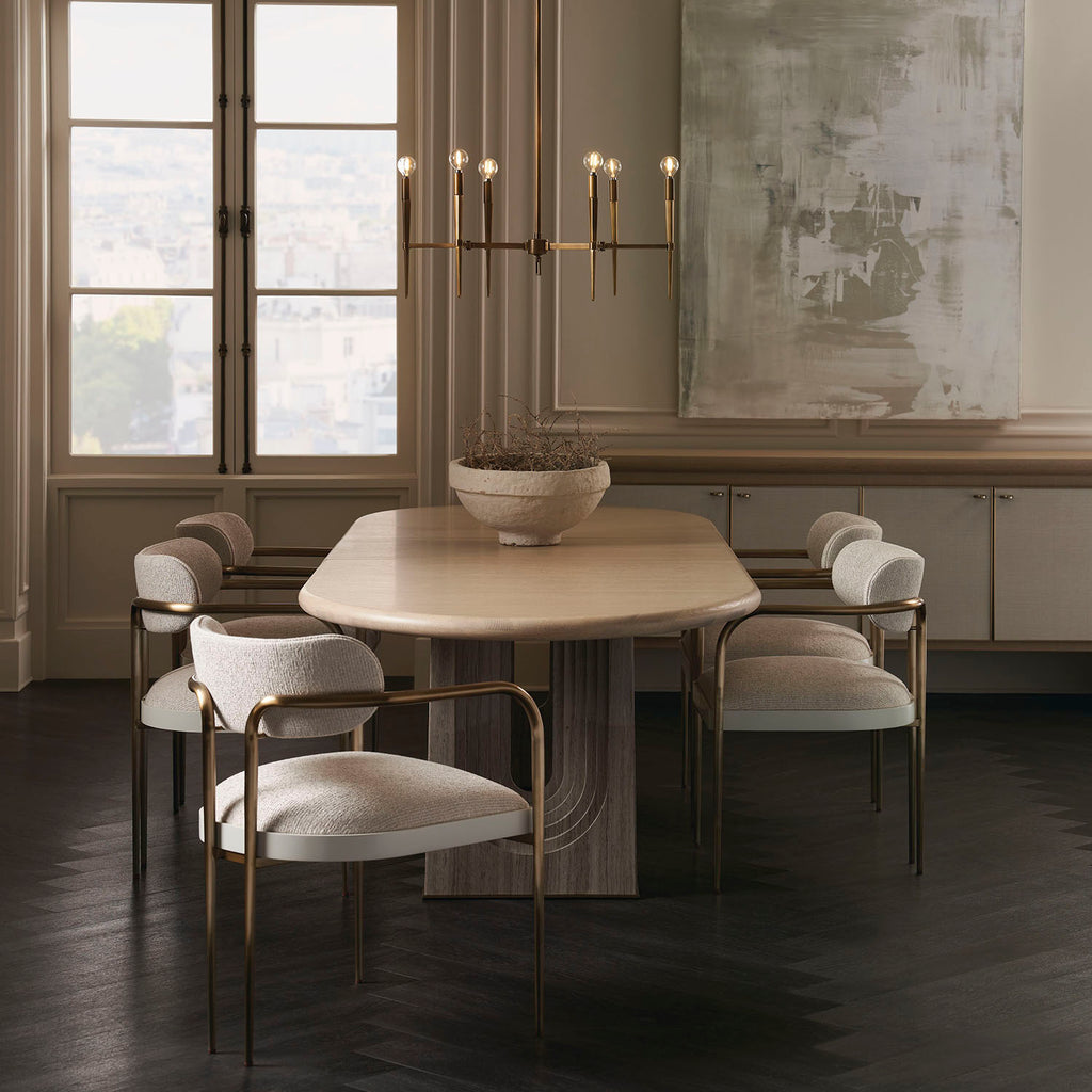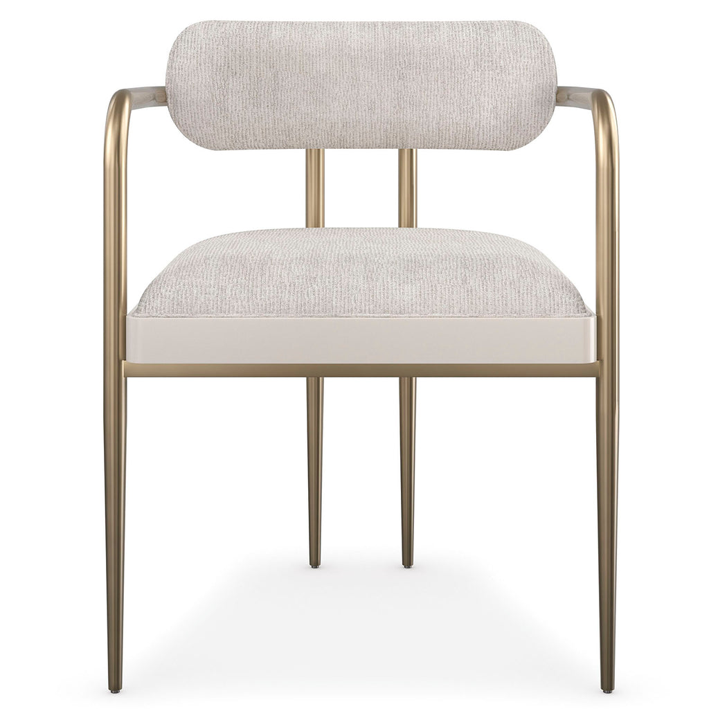 Light in scale with a sinewy silhouette, the Caracole Emphasis dining chair draws on parallel lines and an elegance of design to make a statement of modernity. From simplicity, comes sophistication: curved metal arms in Lucent Bronze and a seemingly floating, bowed back and wood-framed seat in a subtly contrasting, Almost White finish.
