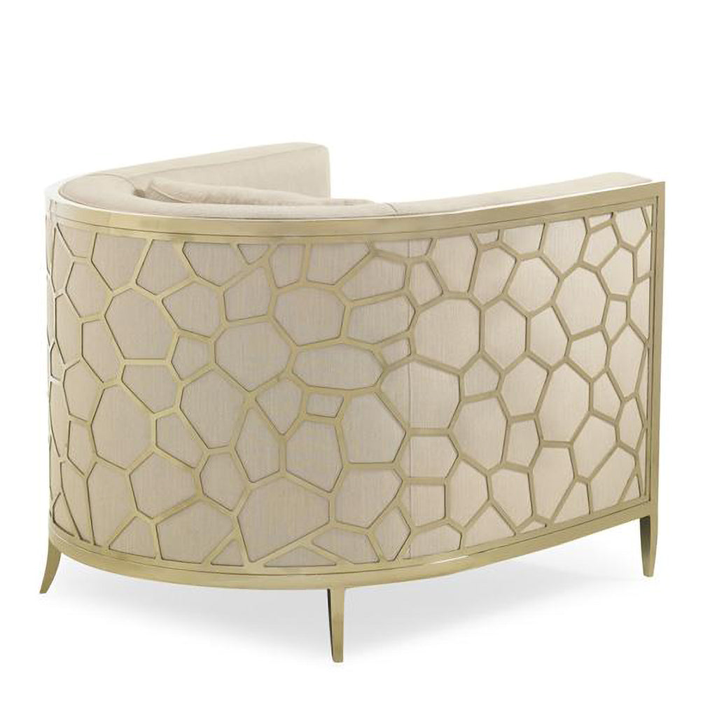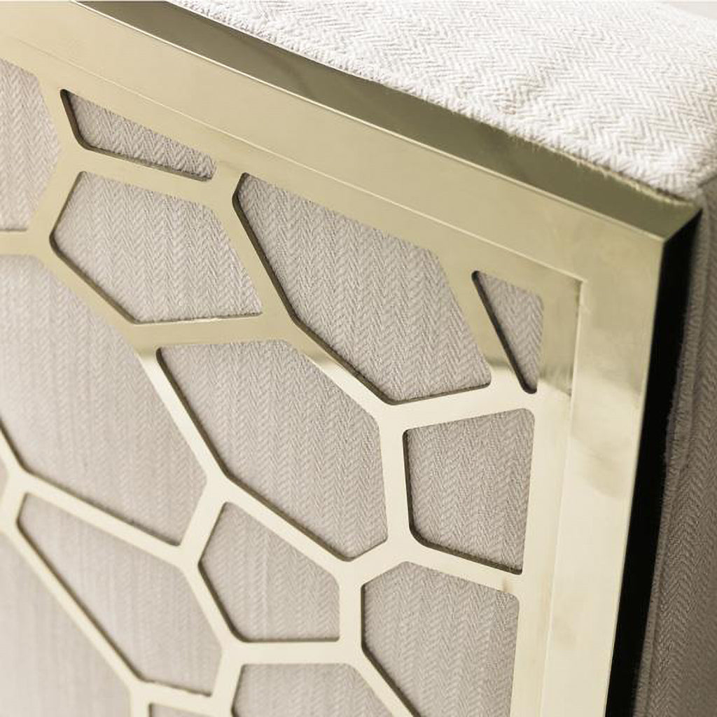 Here’s a chair that’s sure to become a topic of conversation. Its custom-designed pierced-metal frame offers a modern honeycomb design. A micro-herringbone pattern in off-white linen-blend offers simplistic beauty. Its geometric simplicity and plush textural appeal will add visual interest to any space.