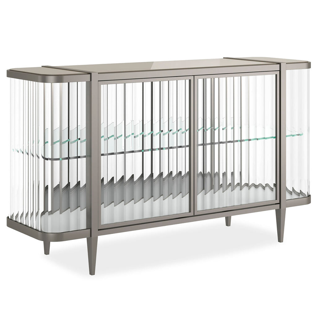It’s true, this console is so extraordinary, you can’t help but Stop And Stare. It’s an instant source of brightness and reflectivity that creates a natural focal point. A wavy acrylic exterior mirrors the undulating patterns of sand and sea while its top adds another layer of organic splendor. The mirrored interior back and bottom panels are designed to reflect light as it pours in from every angle as well as mirror the beauty of the treasures you display. Glass shelves ensure unobstructed views as do its touch-latch doors with concealed hinges. A Lightly Brushed Chrome finish outlines its rounded silhouette and four tapered feet, imparting the overall luxe feeling of a diamond in a platinum setting.
