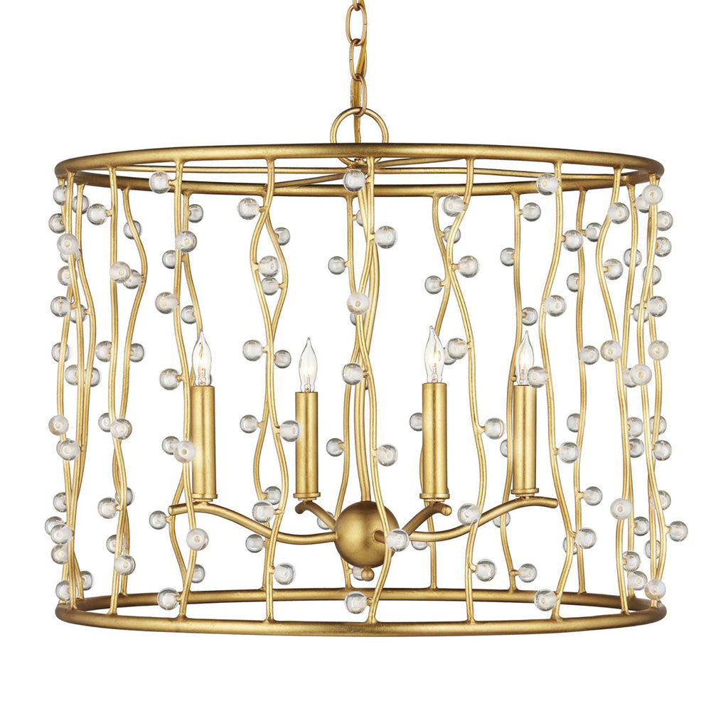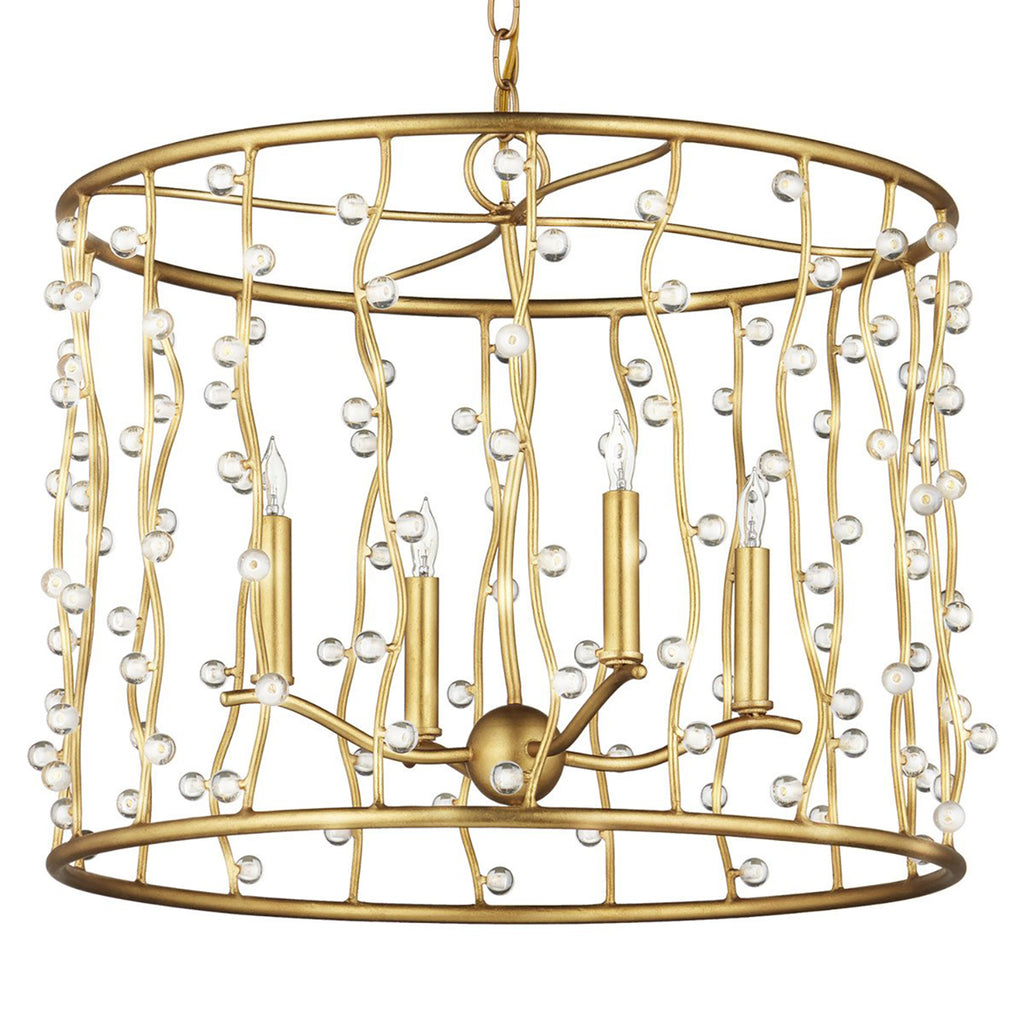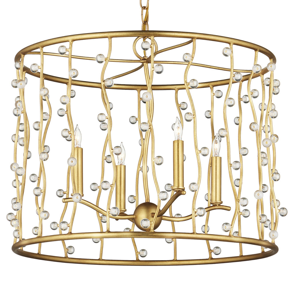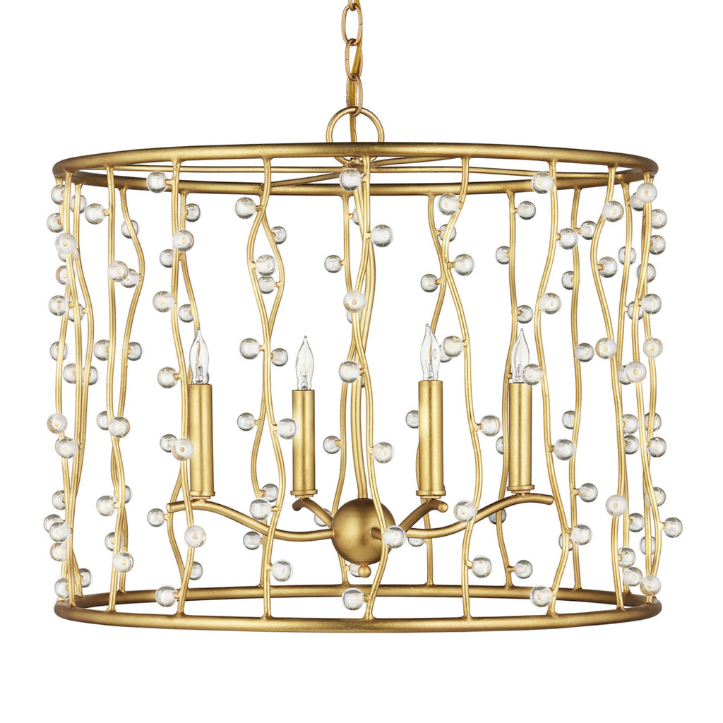 The Currey & Co Adagio Chandelier is a gold chandelier that adroitly holds its crystal beads, which are affixed to wavy metal wires that flow between the top and bottom rings on tiny barbs. The pieces of crystal are prone to glow even when the lights are not switched on, as is the brilliant contemporary gold leaf finish on the metal.