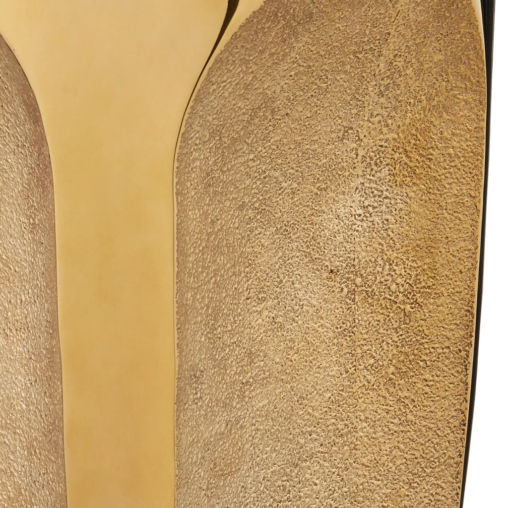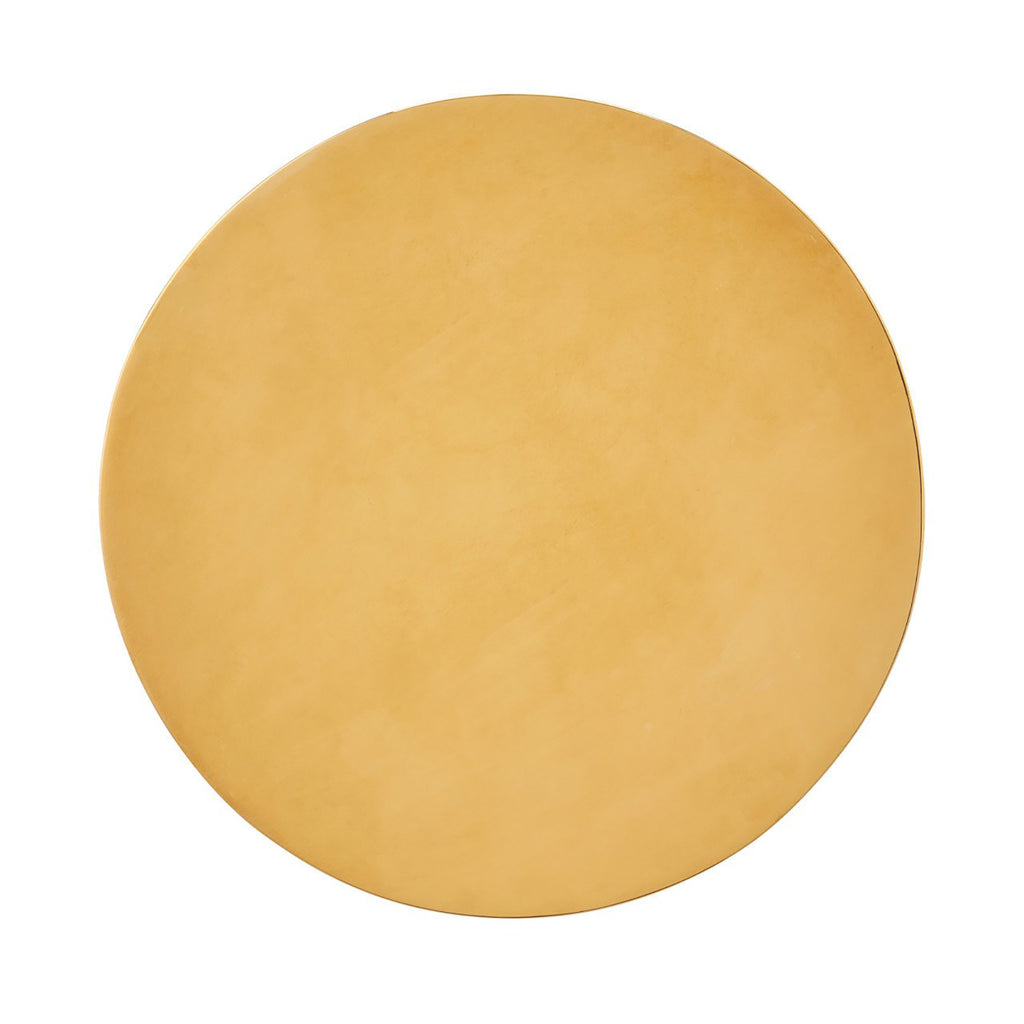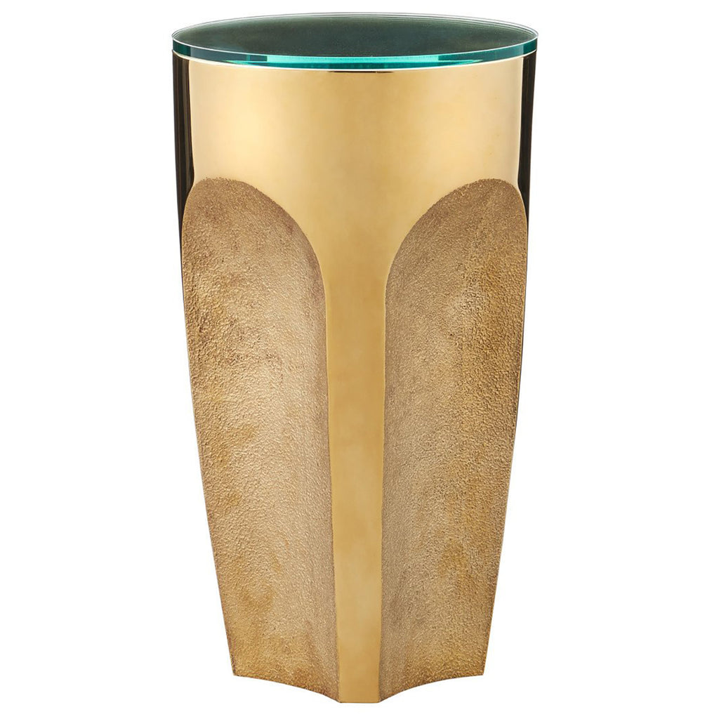The Currey & Co Lemy Drinks Table is a mix master of shapes and textures. Made of stainless steel in a polished brass finish, the gold drinks table has textural indentions that look as if they have been carved out of the metal. The contemporary piece is topped with a tempered glass top.