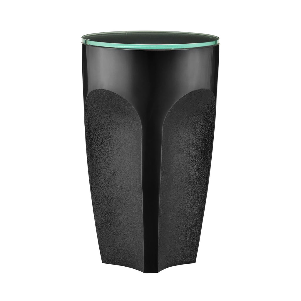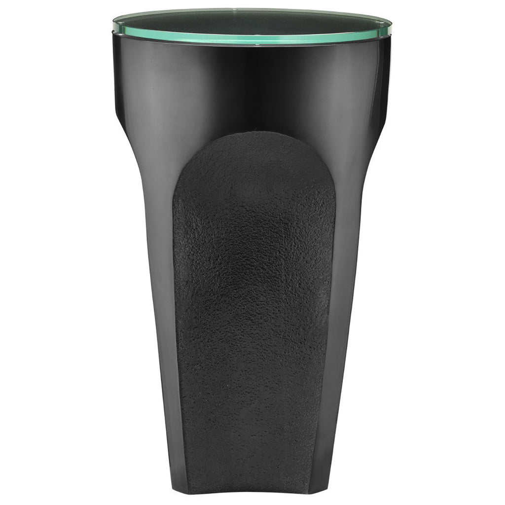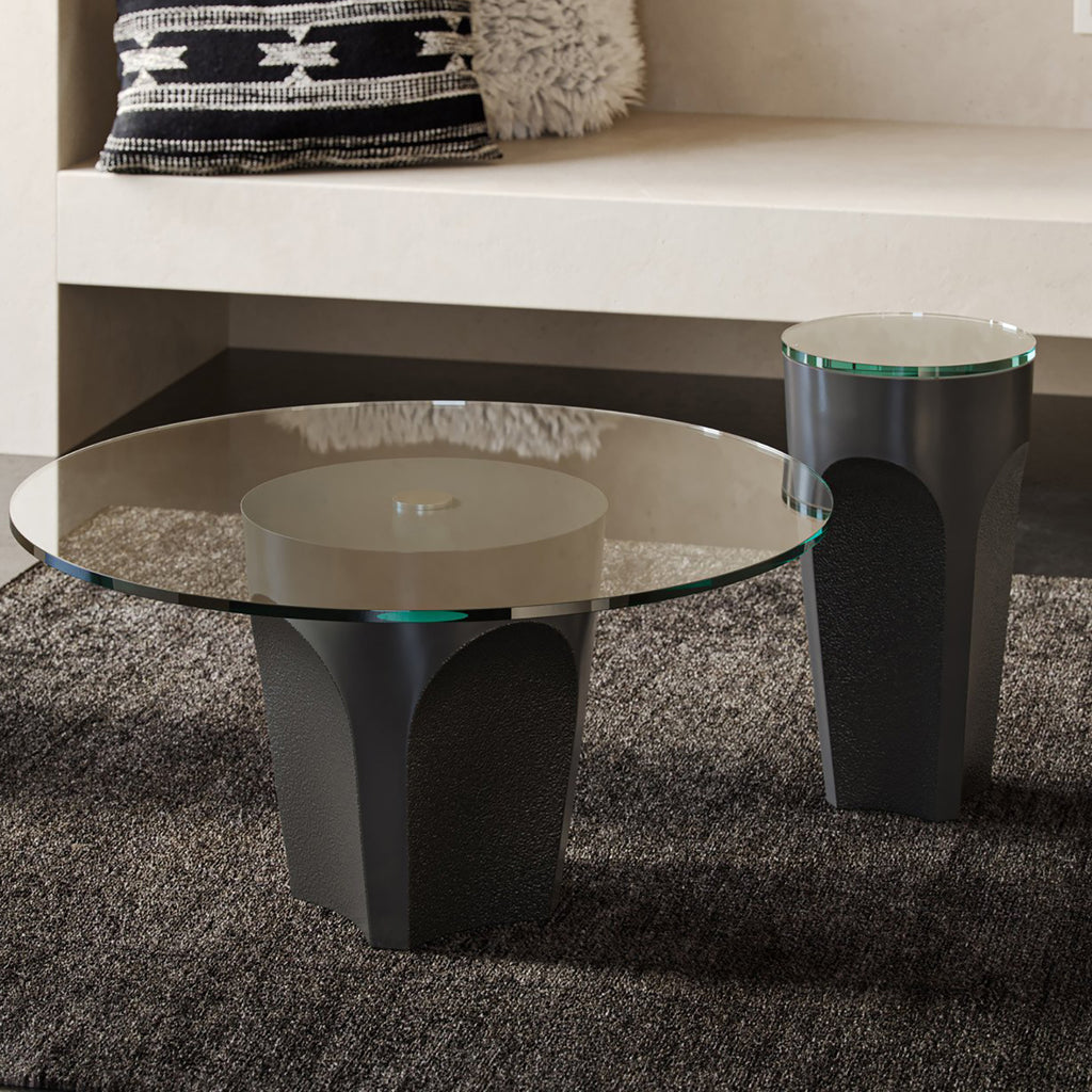 The Currey & Co Lemy Drinks Table is a mix master of shapes and textures. Made of stainless steel in a polished brass finish, the gold drinks table has textural indentions that look as if they have been carved out of the metal. The contemporary piece is topped with a tempered glass top.