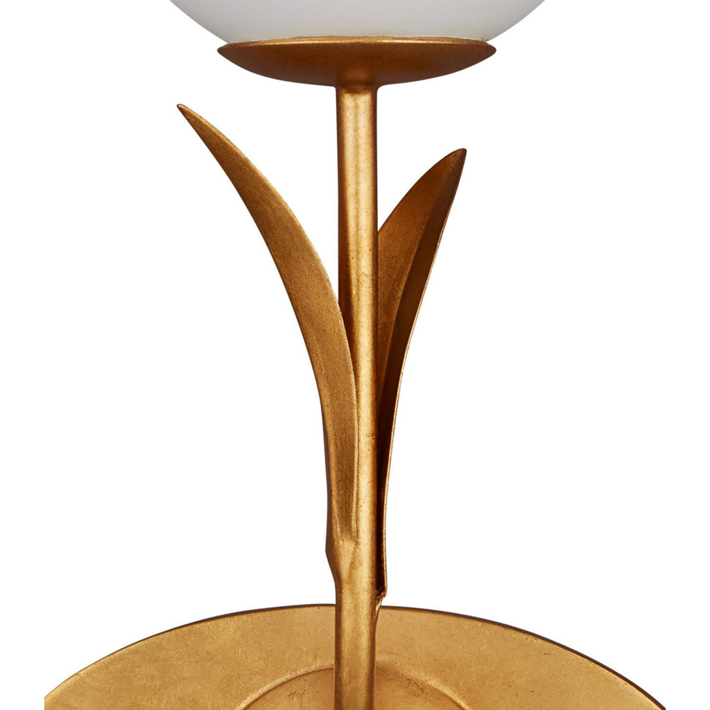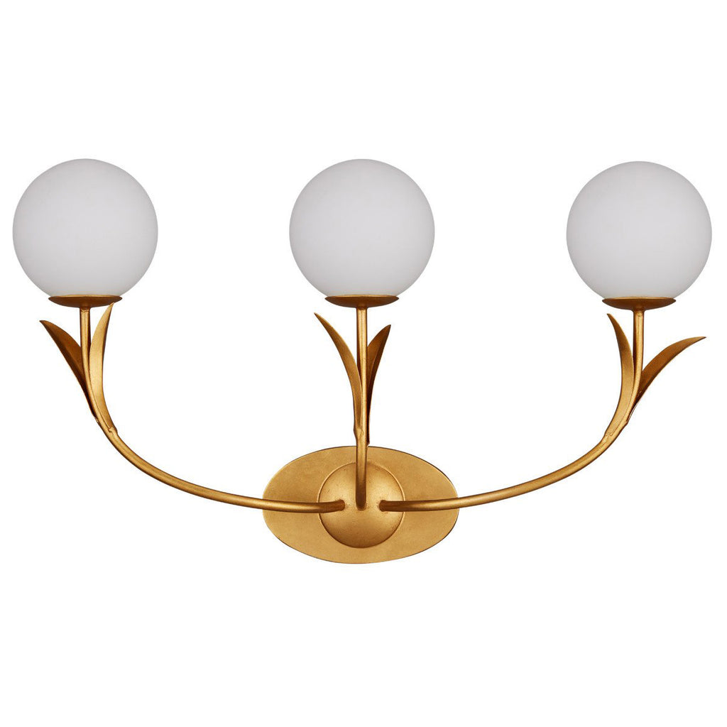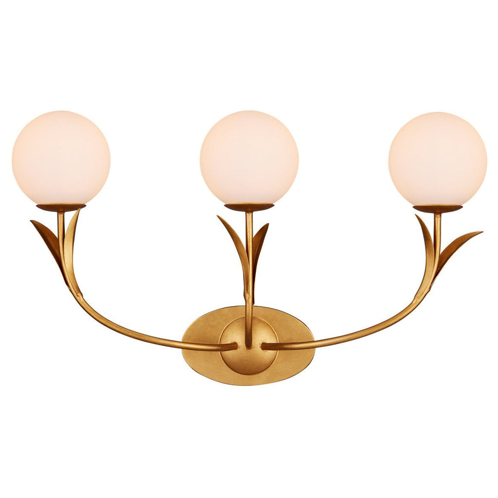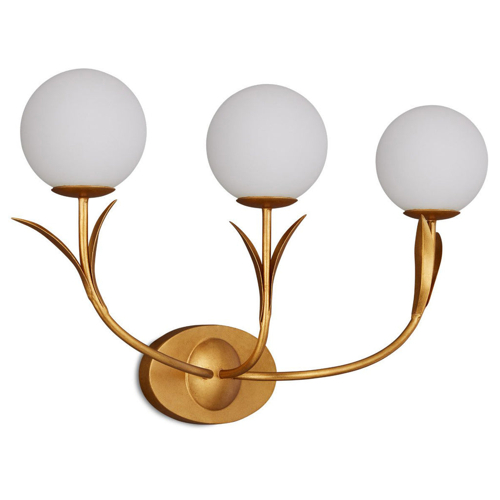 If the Rossville Triple-Light Wall Sconce didn't have such contemporary lines, it could be a throwback to a nostalgic time when globe lights proliferated in ice cream parlors and theaters. But this nature-inspired gold sconce is more modern in its makeup with the thin arcing leaves that flow from it. Made of wrought iron in a contemporary gold leaf finish, the bobeches balance its three white glass globes brilliantly.