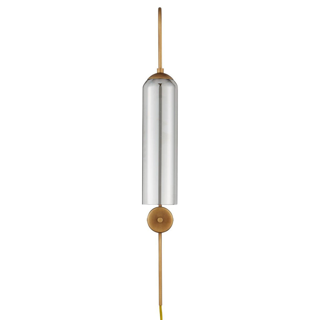 The Severn Wall Sconce is designed with a focus on portability, ideal for bedside use. The smoke textured glass adds a sophisticated look to this gold sconce, which features a dimmer switch in the middle for adjusting the light gradually to avoid disturbing a sleeping partner. The metal on the gold wall sconce is in an antique brass finish.
