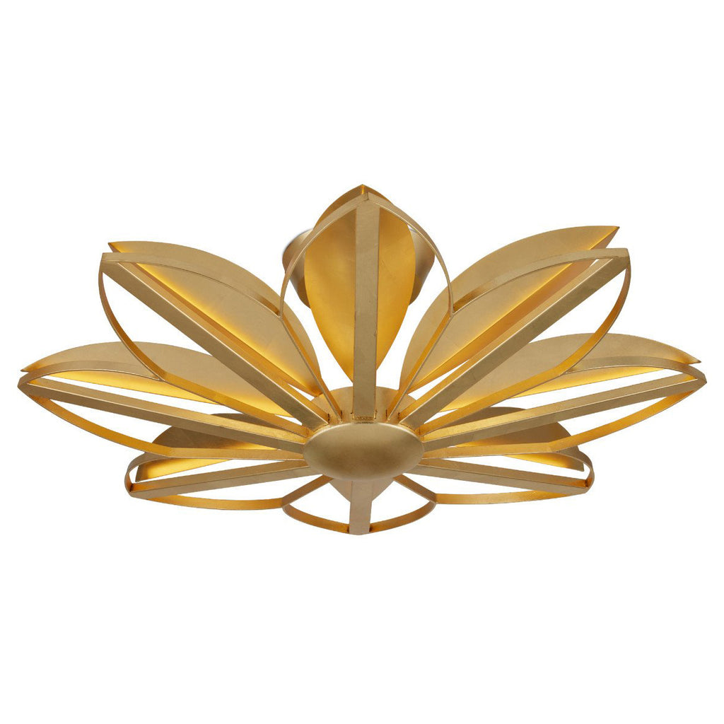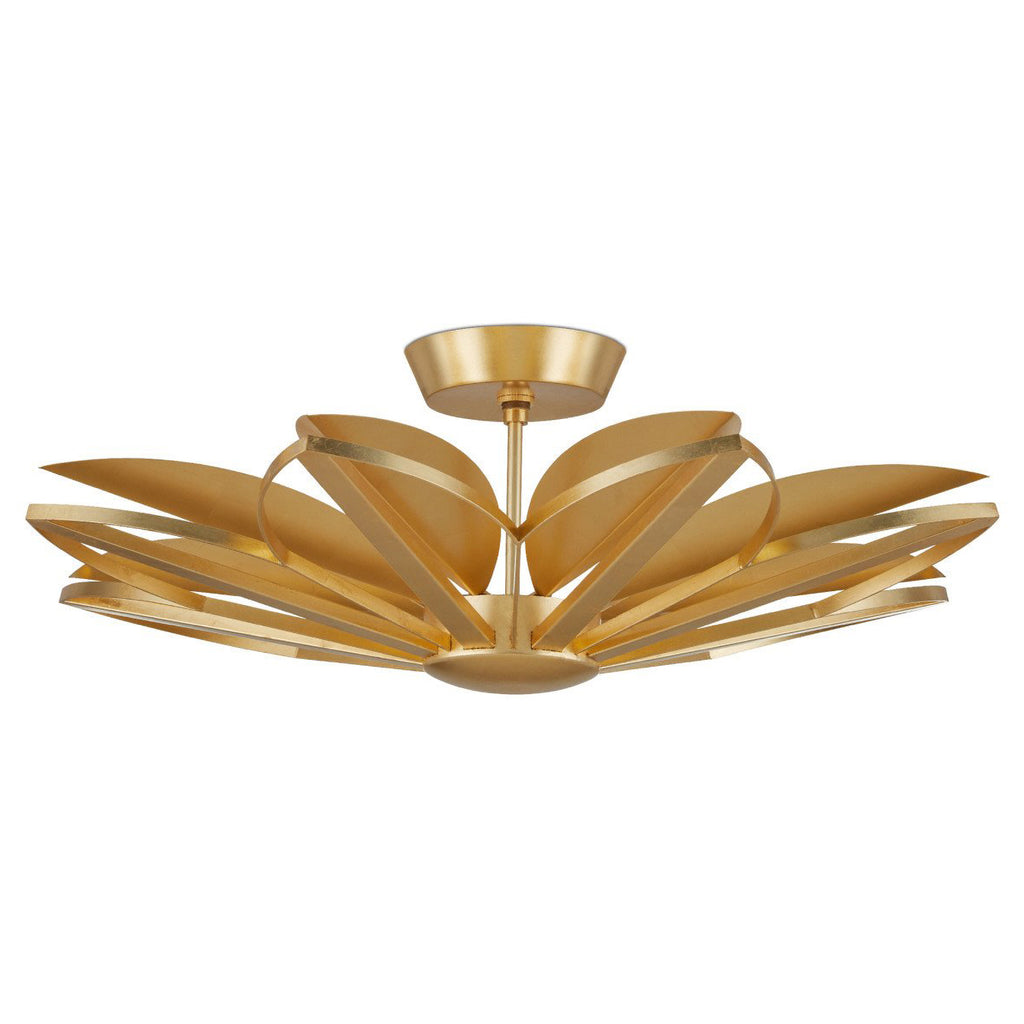 The Stewart Semi-Flush is an artistic exploration of metal with its arcing bands that mimic the shapes of the leaves resting above them. Designed as a nod to botanicals, this fixture is covered in a brilliant gold leaf finish. Bouncing light onto the leaves while simultaneously reflecting it onto the ceiling to create a warm glow was the aim with this nature-inspired gold semi-flush.