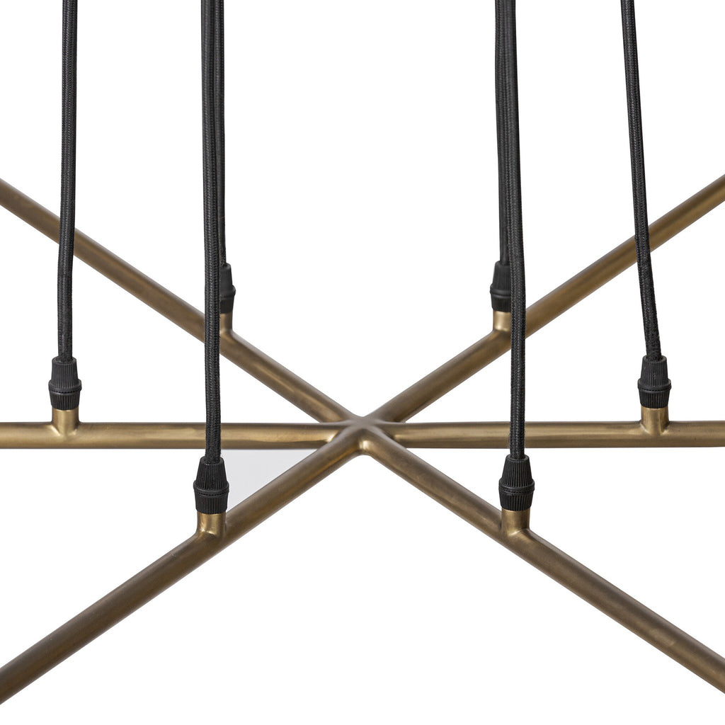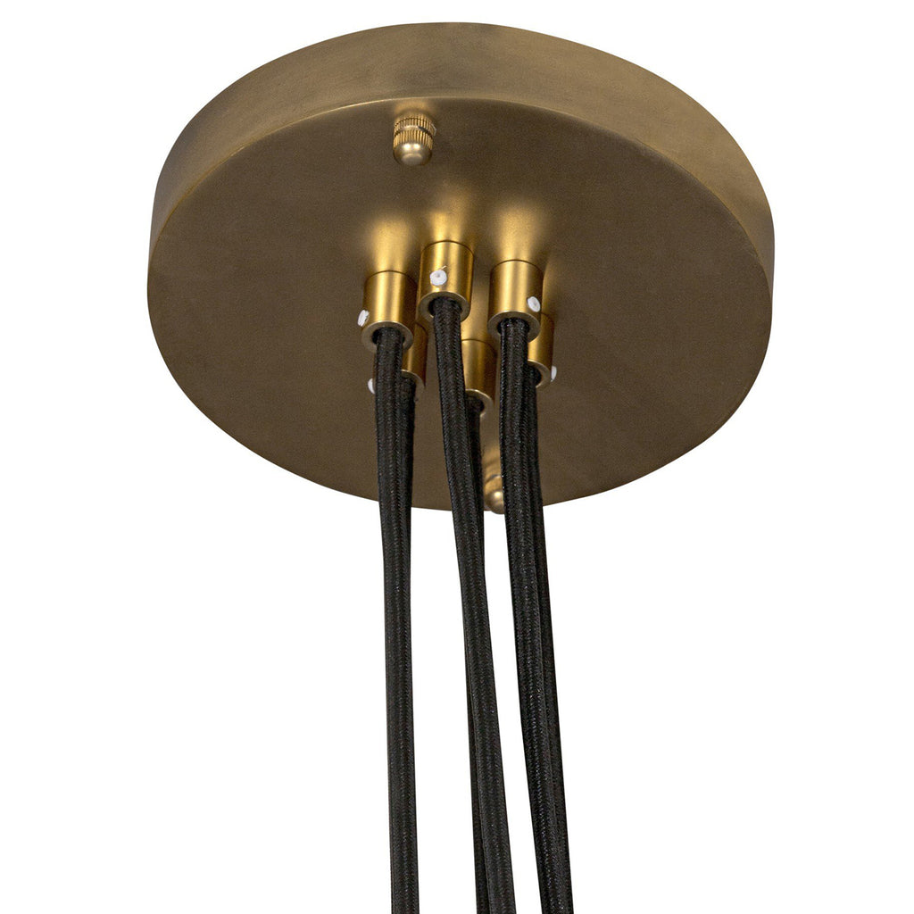Six brass discs float on gently curved arms, suspended by adjustable black fabric cords that become an integral part of the design. The piece invites customization, allowing you to set the perfect length for your space. The bulbs nestle discreetly within each disc, creating a warm, diffused glow. G16.5 bulbs recommended.