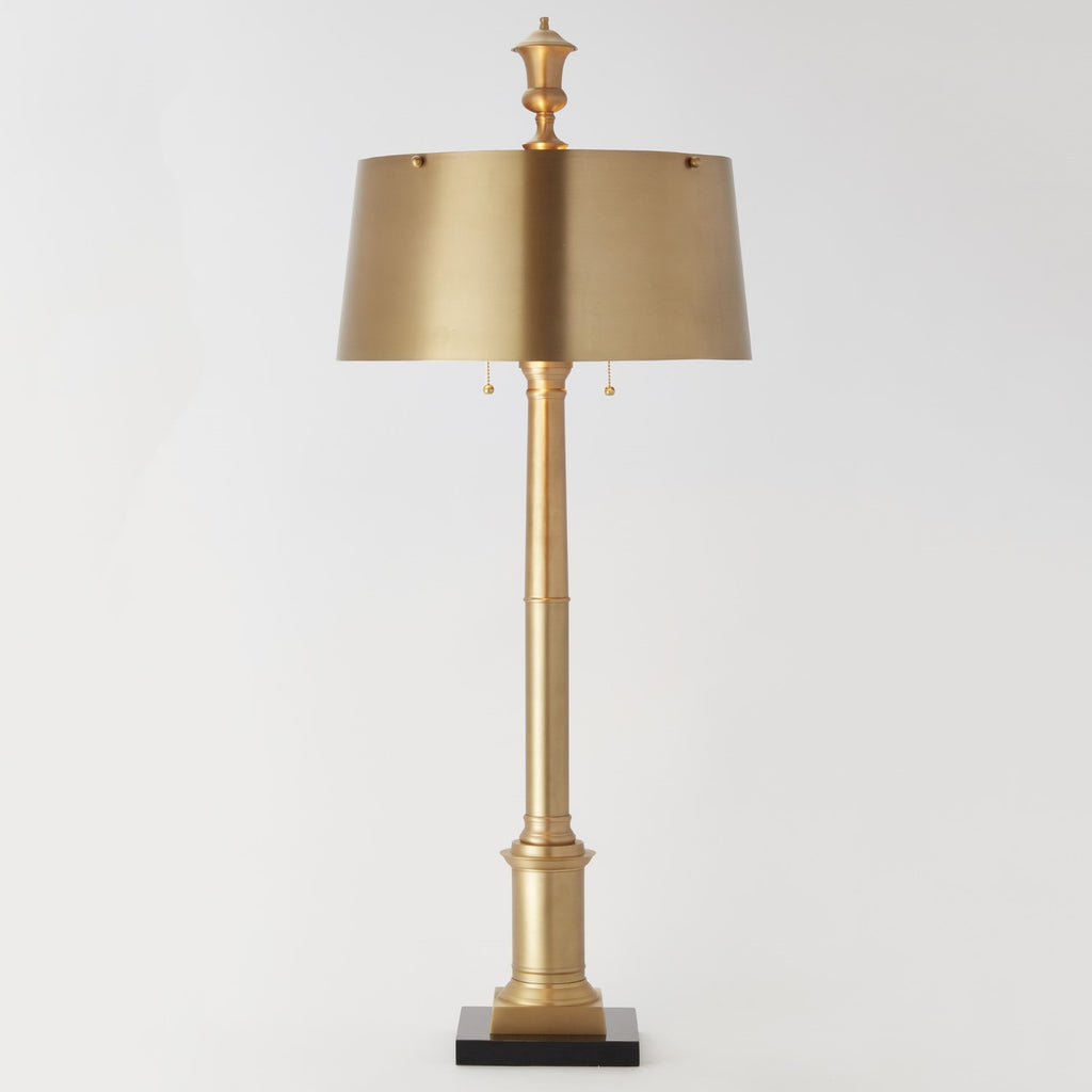 The base of this lamp resembles the stem of our Global Views Library Scale on a black granite base with an S cluster socket and double pull chains. A brass drum shade and urn finial tops it off. This substantial and towering lamp will hold its space in even the grandest of settings.