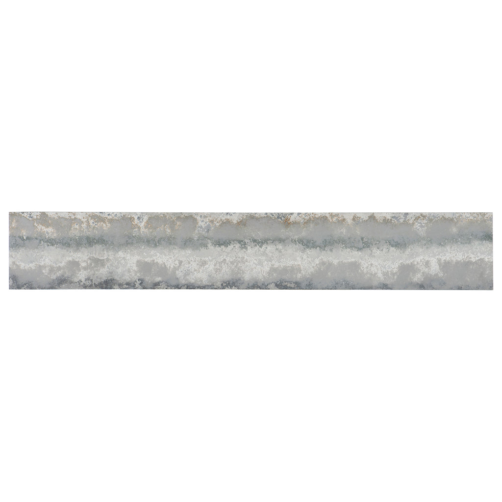 Inspired by the Italian coastline of the Adriatic Sea, classical design is made new in the Lapilli Console Table combining a metal base shaped with airy geometric motifs and an organic stone veneer top. The base is finished in a metallic silver tone with distressing texture applied for tactile appeal.