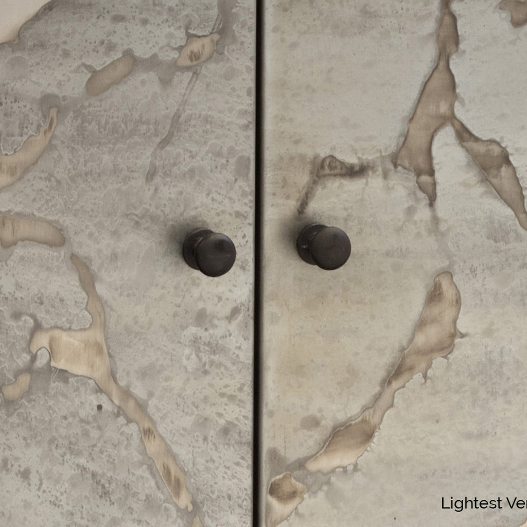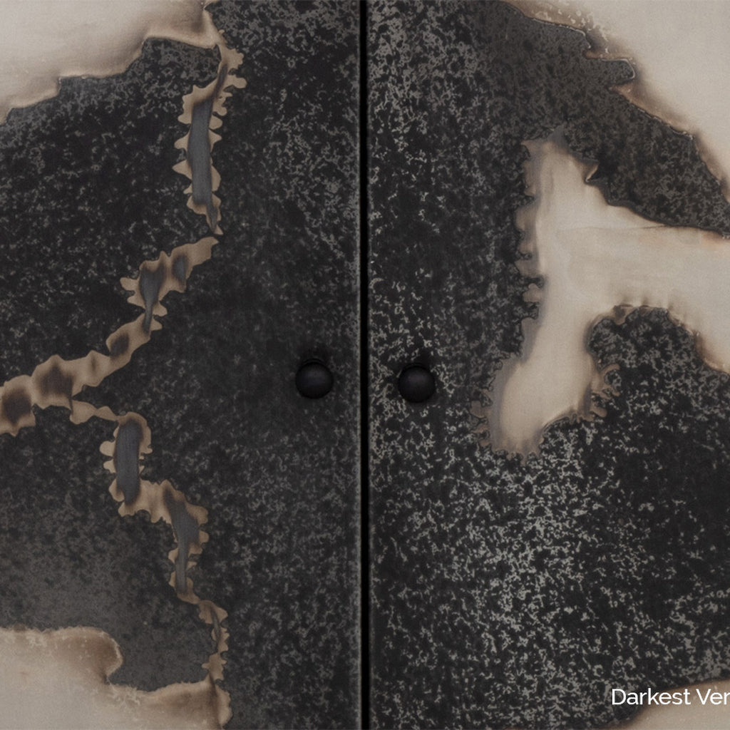Make a bold statement with this unique sideboard. Cabinets feature a one-of-a-kind patina finish, boldly contrasted with a black iron frame.