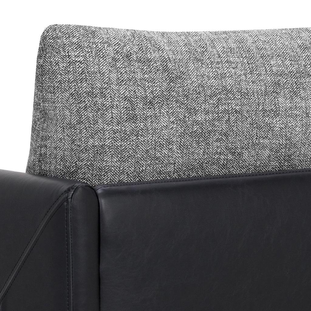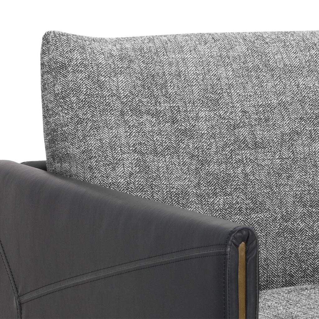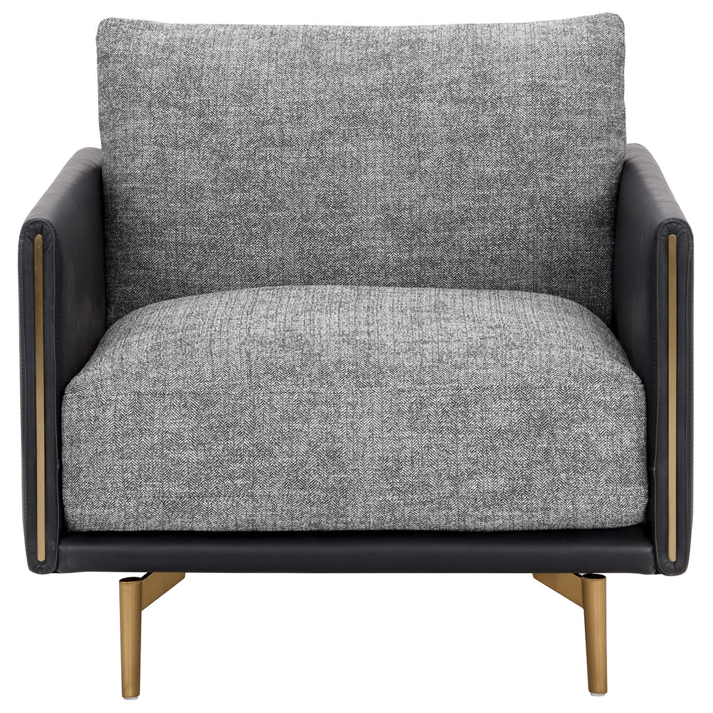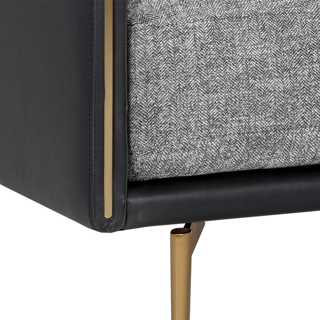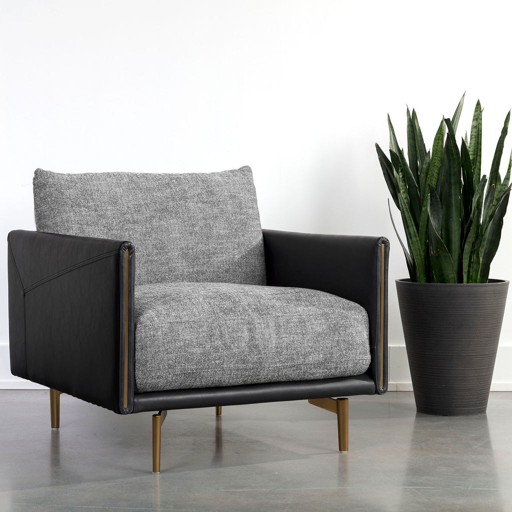 Mixed materials and contrasting colours give the Ashi Armchair an elevated design. Soft cushioning upholstered in nash zebra fabric provides ample comfort. Stitched detailing on the side of the arms gives a subtle geometric design that enhances the coal black faux leather frame. Satin brass aluminum on the legs and trim on the front of the arms ties the look together.