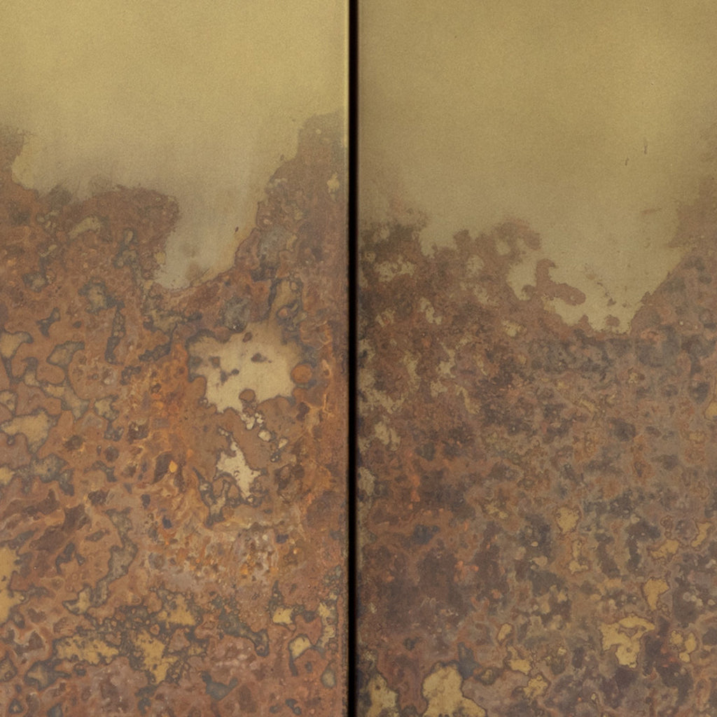 Inspired by global travels, this unique media console and cabinet exudes an exotic vibrance. Features four cabinets with antique brass ombre patina fronts. Completed with a black metal frame.