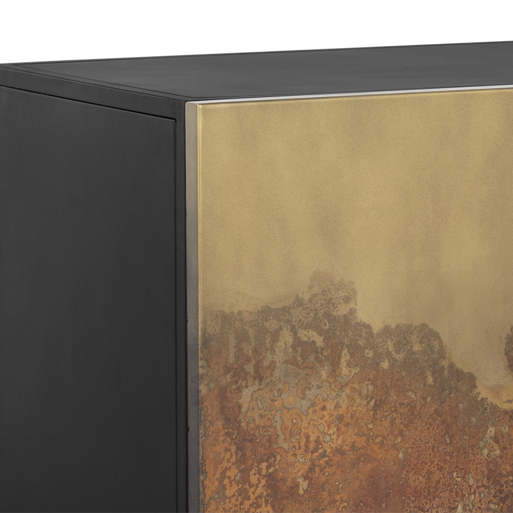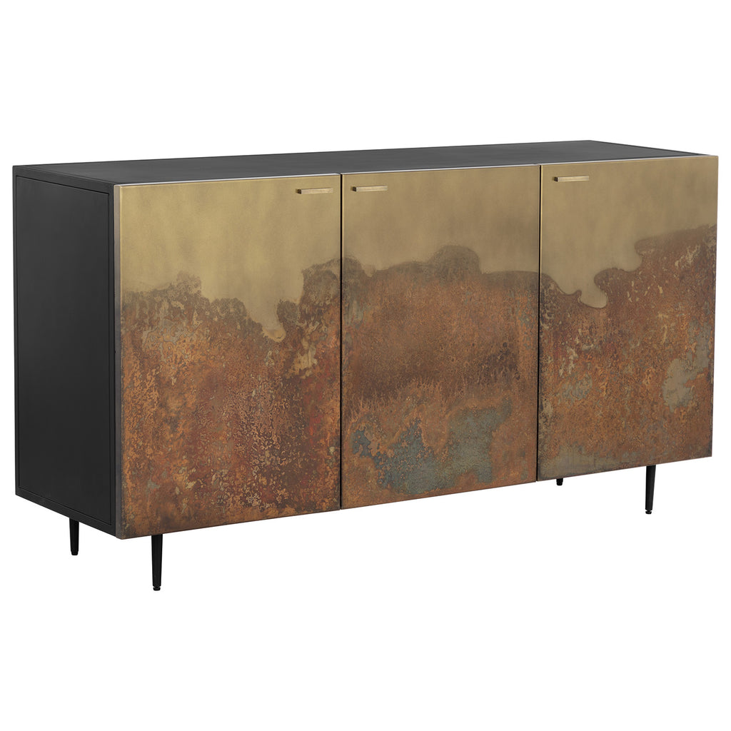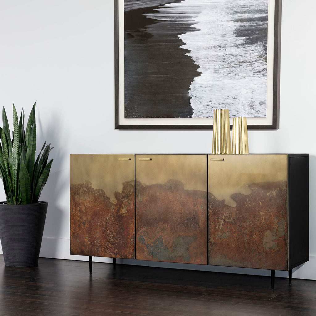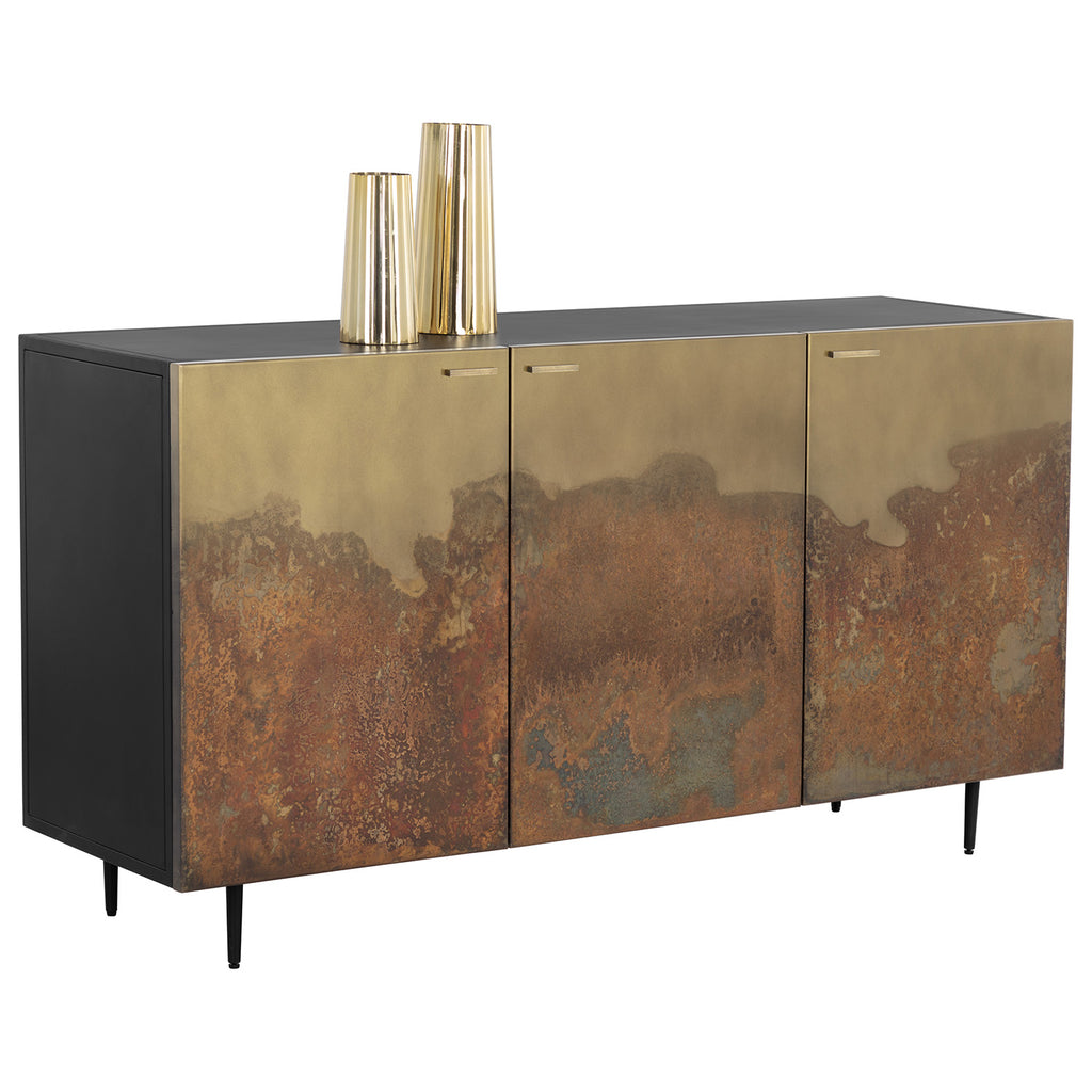 Inspired by global travels, this unique sideboard exudes a exotic vibrance. Features three cabinets with antique brass ombre patina fronts. Completed with a black metal frame. Pairs well with the Auburn media console and cabinet. Made in India. With refined craftsmanship, this design was brought to life by skilled local artisans. By nature, these materials develop unique imperfections such as markings and colour variations for a truly one-of-a-kind piece.