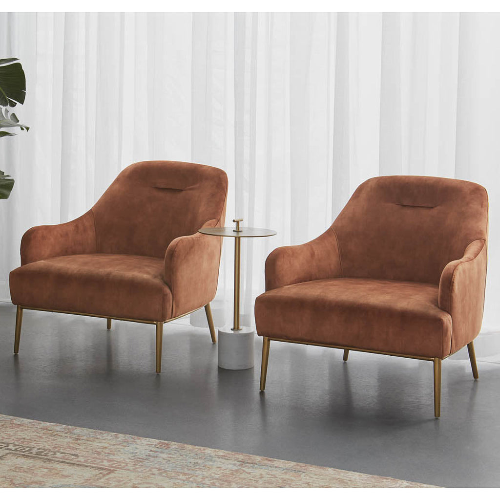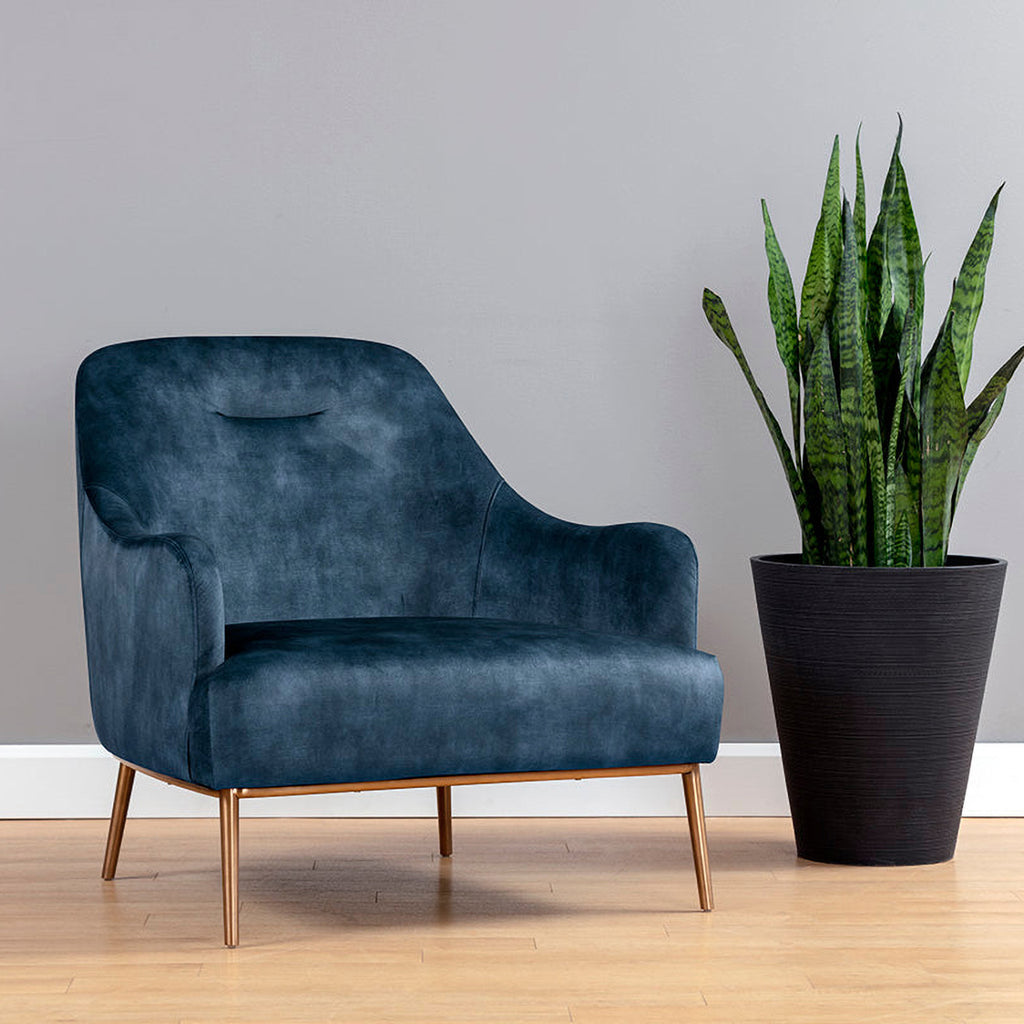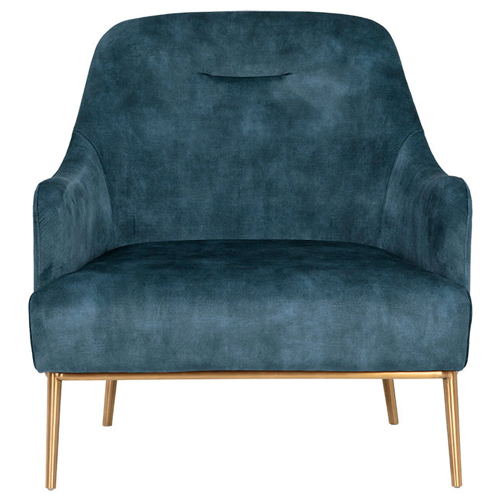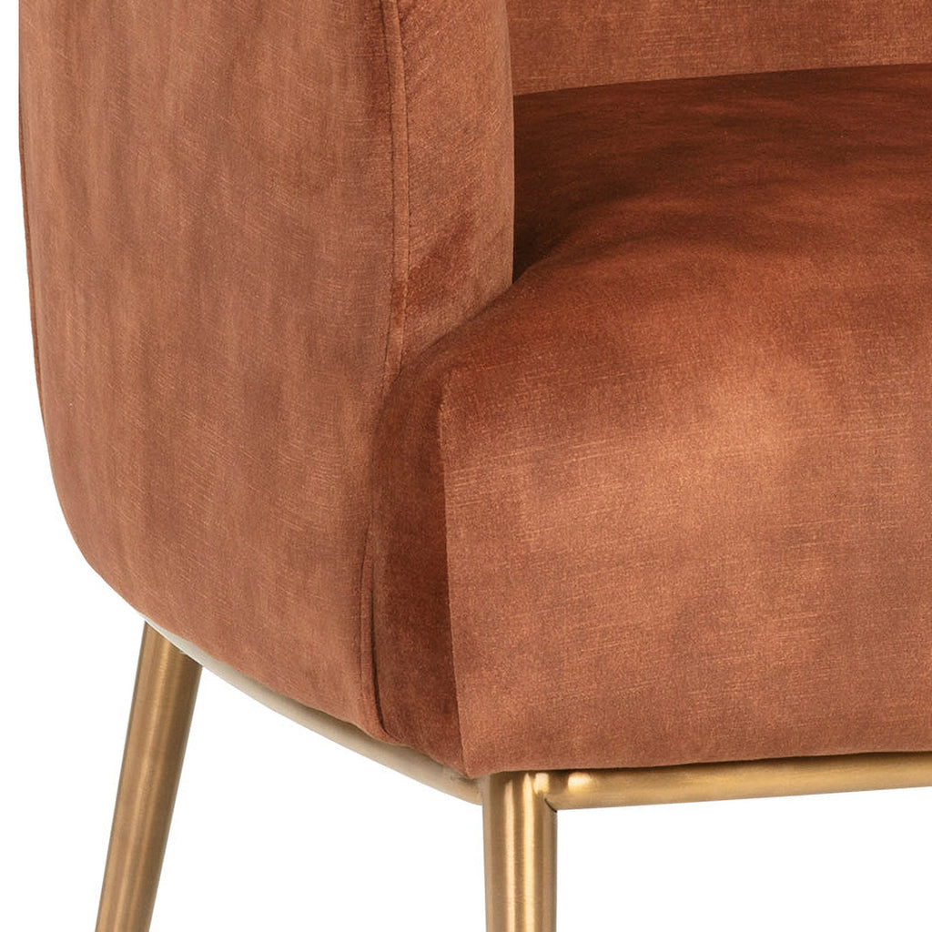 An elegant lounge chair with mid-century modern influence. Designed with a comfortable, single tufted seat and sloping arms. Stocked in a beautiful, velvet-like nono petrol, rust or shitake fabric. Nono fabric features a natural variation of light and dark sections. An exposed gold stainless steel frame and legs complete the look.