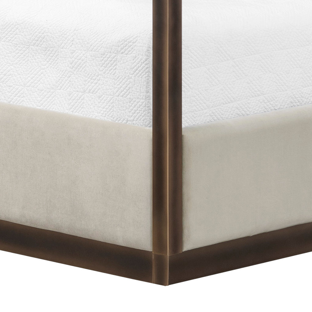 Boasting a regal design, this classic bed features a grand canopy frame that will certainly add a stunning appeal to any bedroom space. Upholstered in piccolo processo performance fabric and features vertical tufting on the headboard. Completed with a rustic bronze iron frame. Performance fabric is moisture repellent, durable and easy to clean.