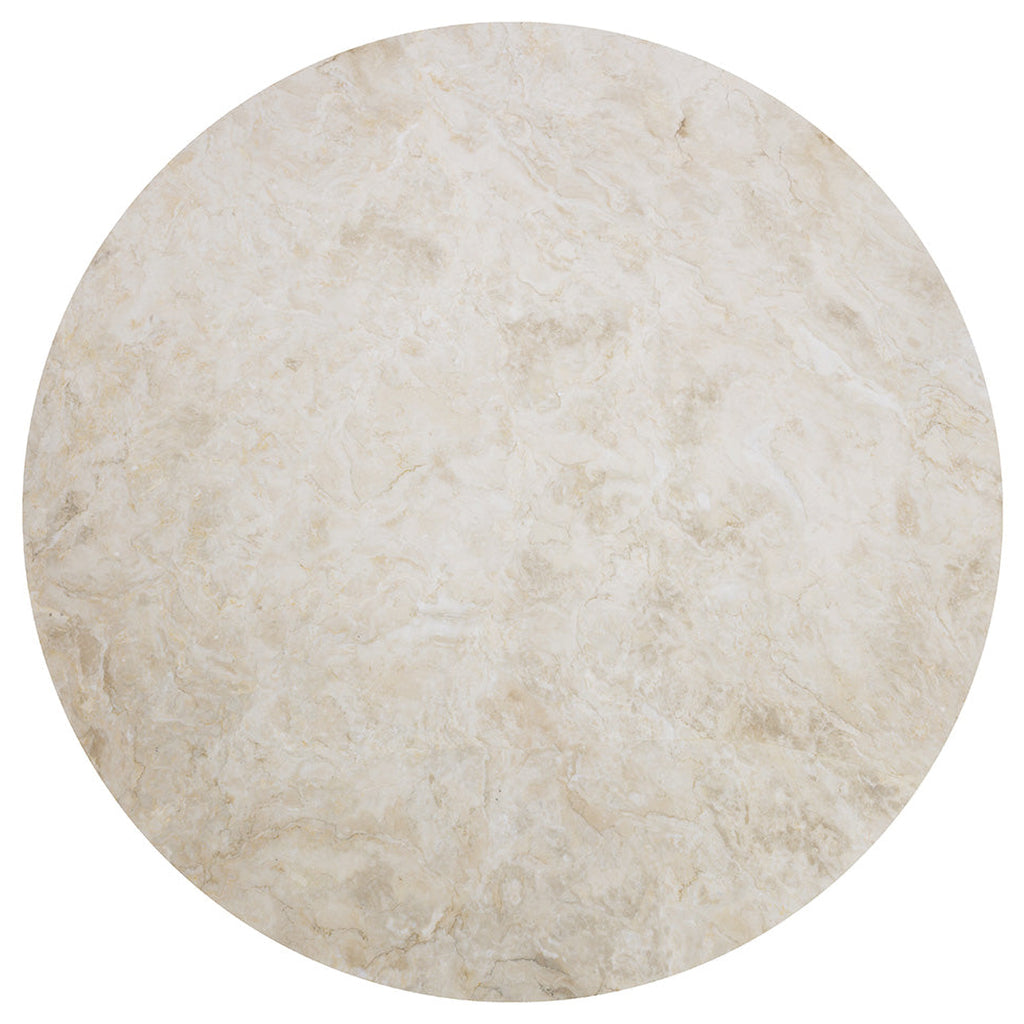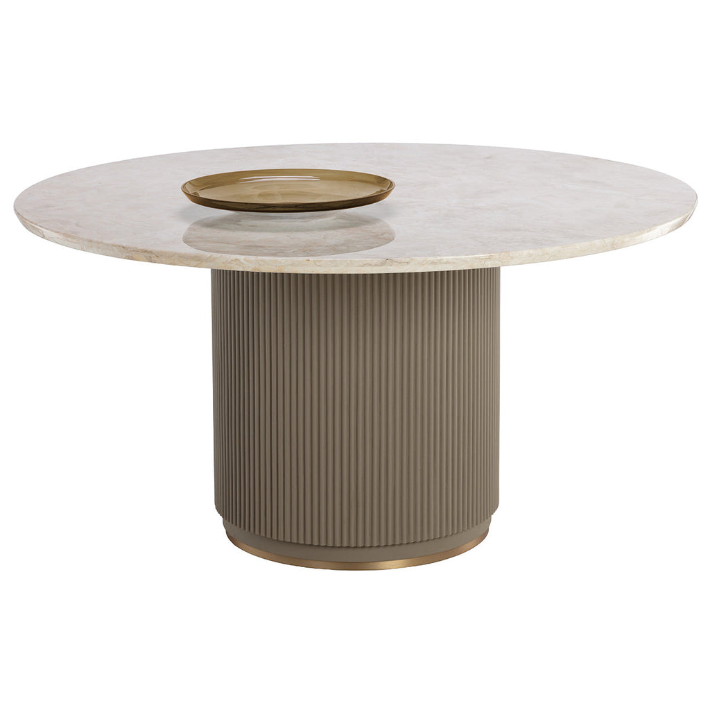 Refined mixed materials with an architectural influence define the Cataldi Dining Table. Fluted detailing in the taupe faux leather base adds intriguing texture that contrasts against the smooth polished beige marble tabletop. Gold stainless steel trim at the bottom of the base finishes the piece.